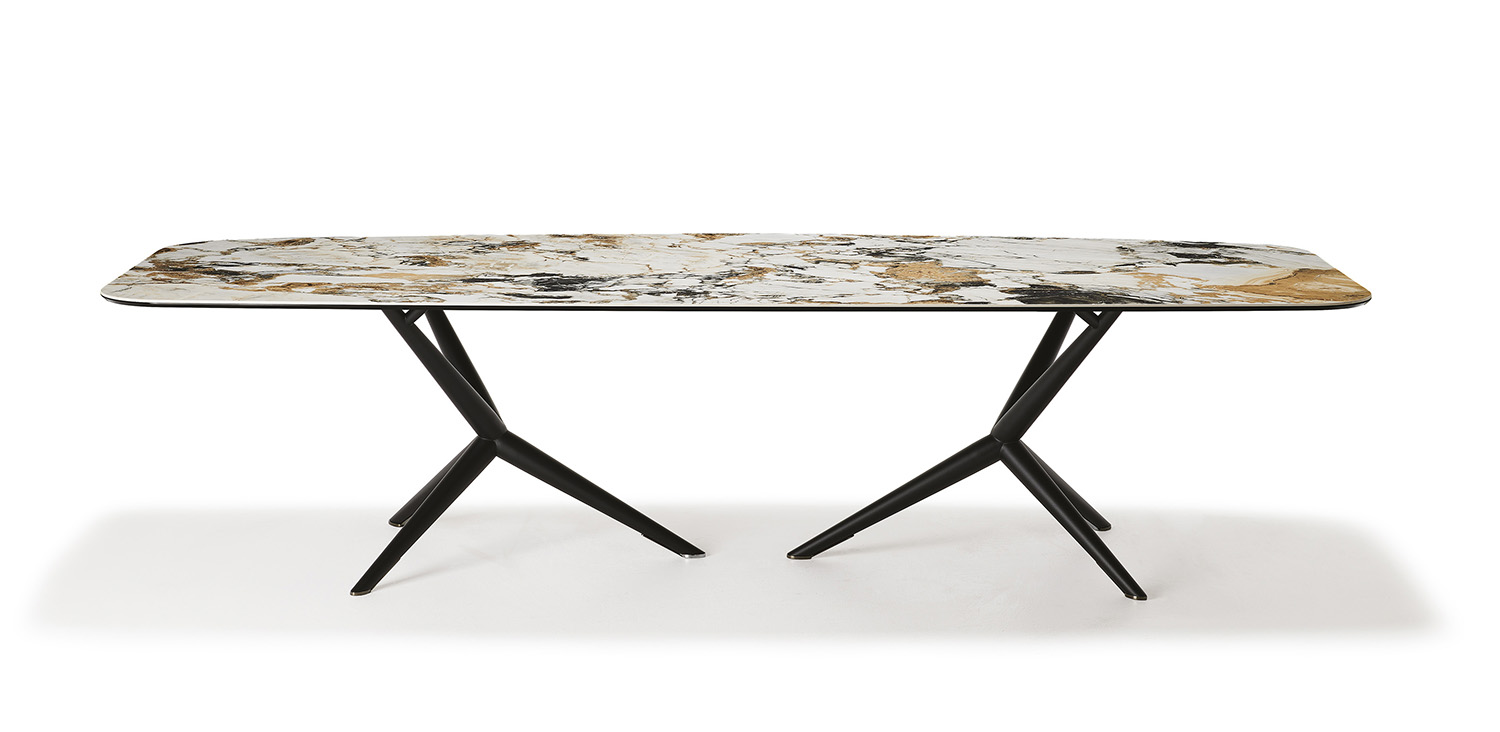 Table with titanium (GFM11), bronze (GFM18), graphite (GFM69) or black (GFM73) embossed lacquered steel base. Feet in black chrome (06). Top in ceramic Marmi Calacatta (KM01), Alabastro (KM02), Ardesia (KM04), matt Golden Calacatta (KM05), glossy Golden Calacatta (KM06), matt Portoro (KM07), glossy Portoro (KM08), glossy Sahara Noir (KM09), Emperador (KM10), Makalu (KM11), Breccia (KM12) or Arenal (KM13).