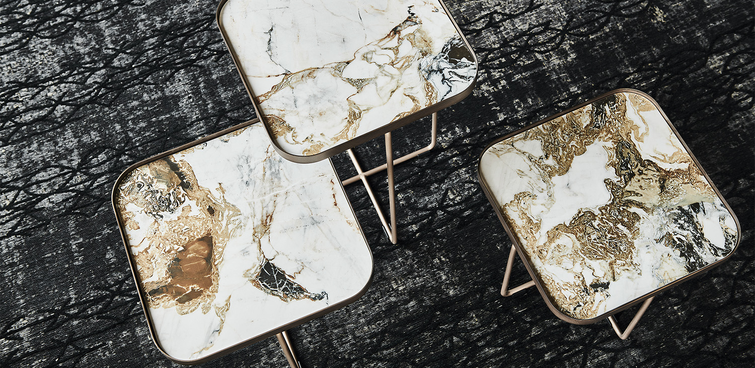 Coffee table with frame in embossed titanium (GFM11) or black (GFM73) lacquered steel, or with base in Bronze and Brushed Bronze top frame. Marmi Calacatta (KM01), Alabastro (KM02), Ardesia (KM04), matt Golden Calacatta (KM05), glossy Golden Calacatta (KM06), matt Portoro (KM07), glossy Portoro (KM08), glossy Sahara Noir (KM09), Emperador (KM10), Makalu (KM11), Breccia (KM12), Arenal (KM13) or Zefiro (KZ20) ceramic top.