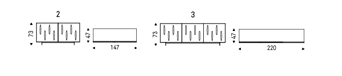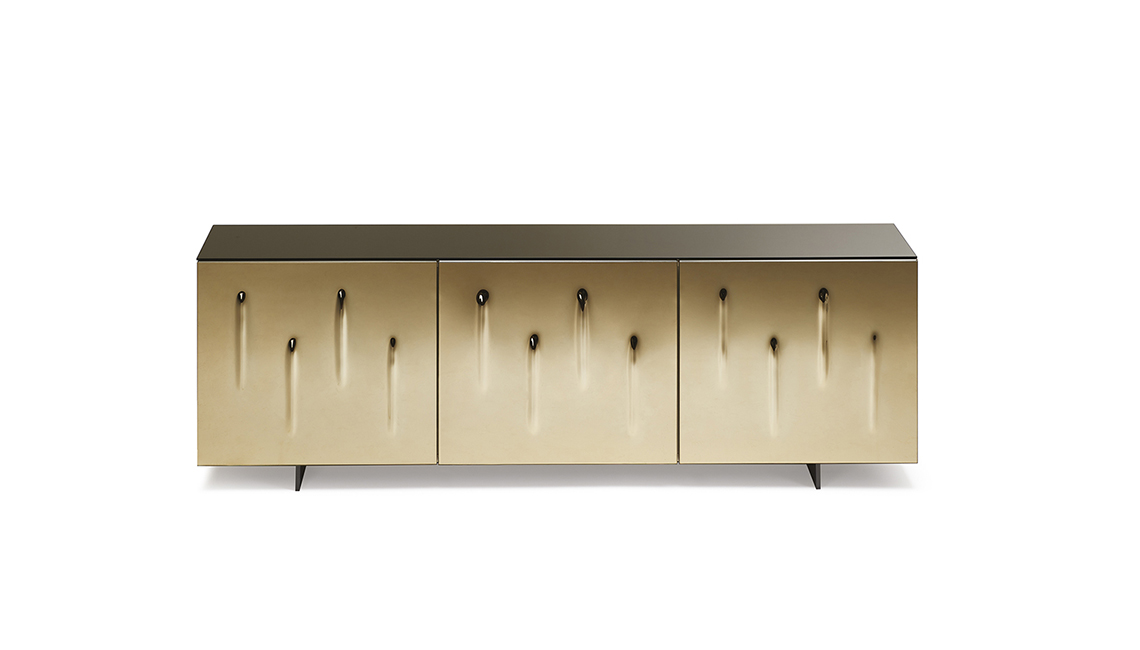 Sideboard 2 or 3 doors lacquered glossy moka (L4), glossy white (L7), matt white (OP7), matt graphite (OP69) or titanium (M11). Doors in smoked grey or bronze convex mirrored glass with embossed titanium (GFM11) aluminum profiles. Polished stainless steel feet, matt white (OP71) or graphite (OP69) varnished. Internal clear glass shelves. Optional: internal drawer in each door. Optional: mirrored glass top matching the doors colour.