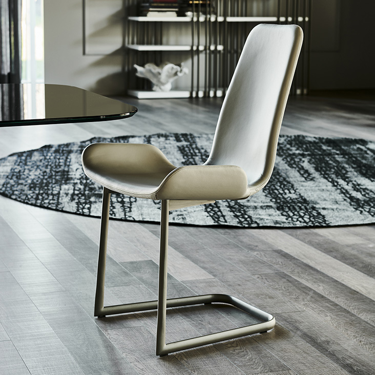 Chair with cantilever frame in titanium (GFM11), graphite (GFM69), white (GFM71) or black (GFM73) embossed lacquered steel. Upholstered seat in fabric, synthetic nubuck, micro nubuck, synthetic leather or soft leather as per sample card. The cover is not removable.