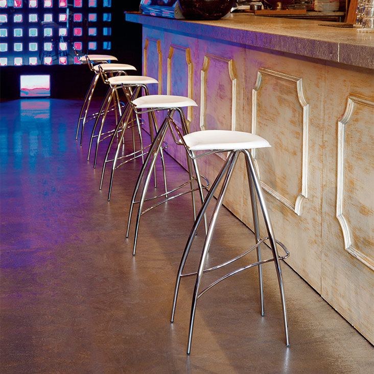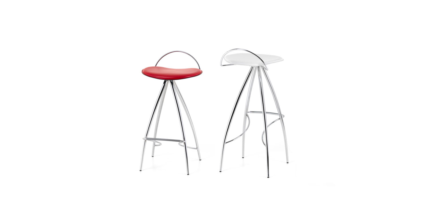 Stool with chromed (08), black chrome (06), black (OP17), white (OP71) or graphite (OP69) lacquered metal frame and seat in leather as per sample card. Standard stitching.