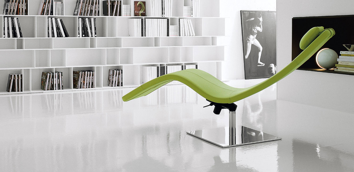 Swiveling and adjustable chaise longue. Polished stainless steel or black (GFM73) embossed lacquered base and wooden frame upholstered and covered in fabric, synthetic nubuck, micro nubuck, synthetic leather or soft leather as per sample card. The cover is not removable.