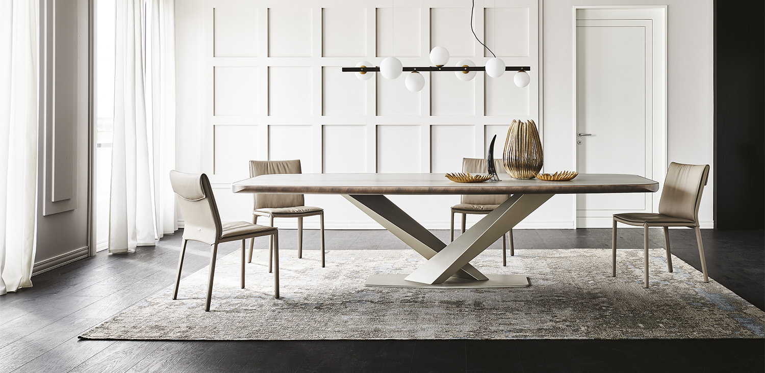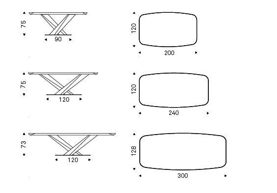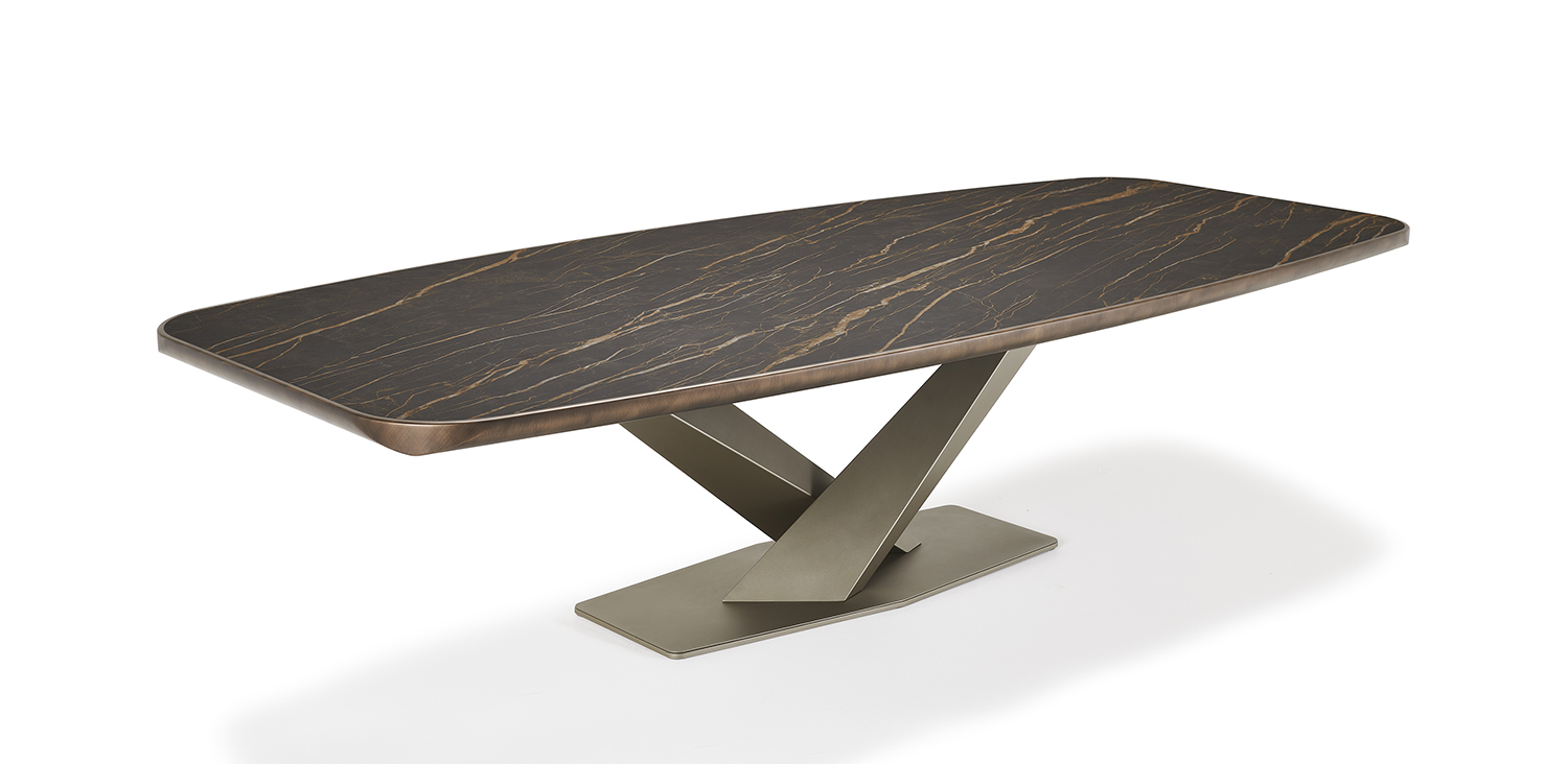 Table with base in titanium (GFM11), bronze (GFM18), graphite (GFM69) or black (GFM73) embossed lacquered steel. Top in ceramic Marmi Calacatta (KM01), Alabastro (KM02), Ardesia (KM04), matt Golden Calacatta (KM05), glossy Golden Calacatta (KM06), matt Portoro (KM07), glossy Portoro (KM08), glossy Sahara Noir (KM09), Emperador (KM10), Makalu (KM11), Breccia (KM12) or Arenal (KM13) with black or Brushed Bronze lacquered and rounded lower profile. 6cm thick wooden top on 300x128 version and 5cm on 200x120 and 240x120 versions.