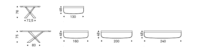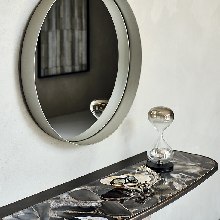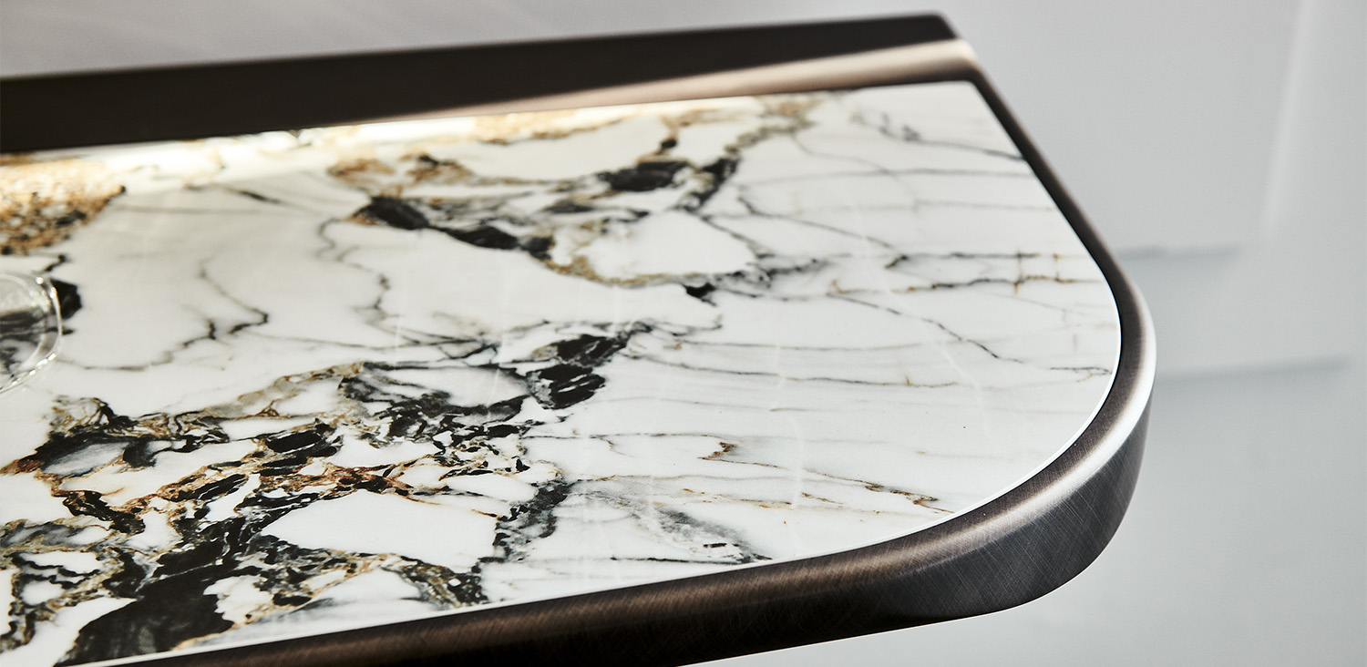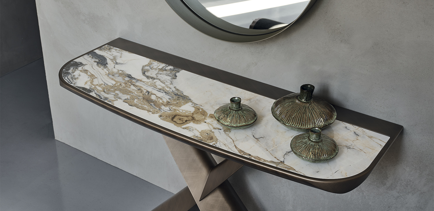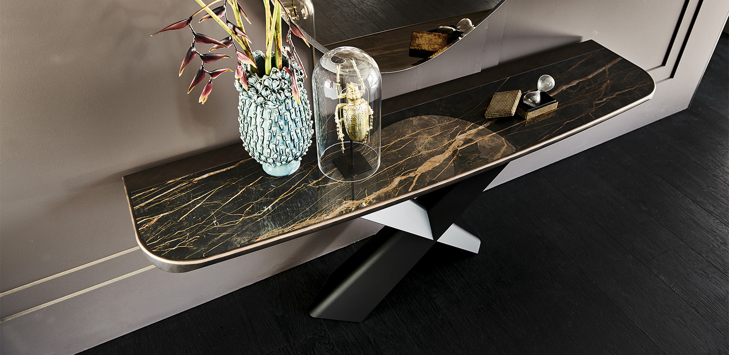 Console with base in titanium (GFM11), graphite (GFM69) or black (GFM73) embossed lacquered steel or Brushed Bronze. Top in ceramic Marmi Calacatta (KM01), Alabastro (KM02), Ardesia (KM04), matt Golden Calacatta (KM05), glossy Golden Calacatta (KM06), matt Portoro (KM07), glossy Portoro (KM08), glossy Sahara Noir (KM09), Emperador (KM10) or Makalu (KM11) with black or Brushed Bronze lacquered and rounded lower profile. Wall anchorage is necessary. 5cm thick wooden top.