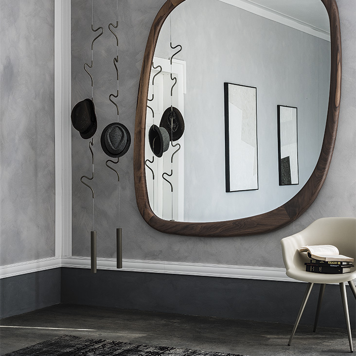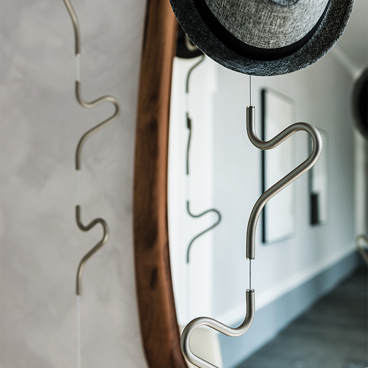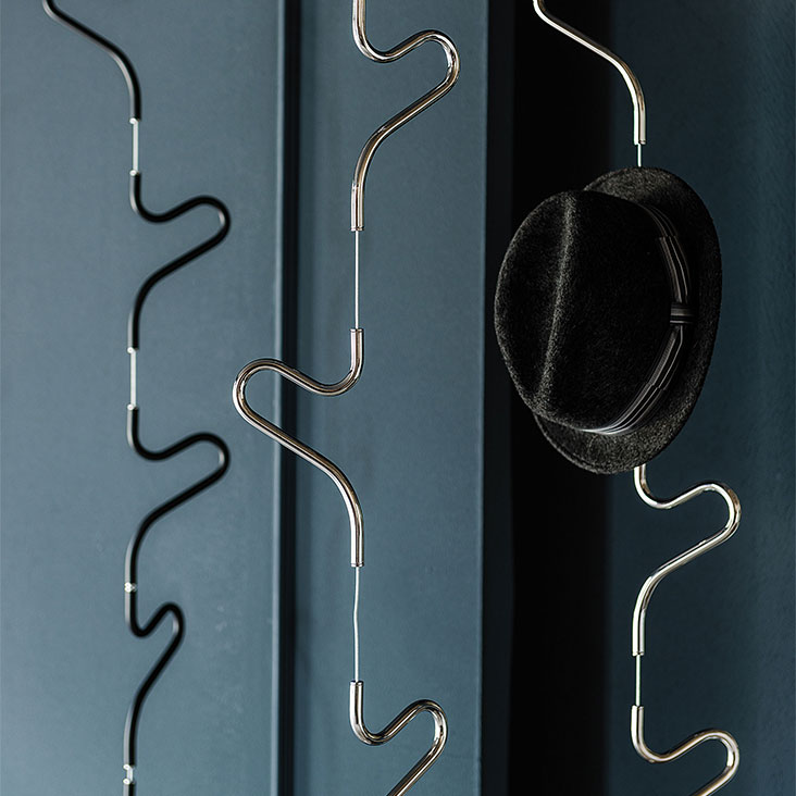 Ceiling clothes hanger with steel cable: Hangers and details in chromed steel (08), matt white (OP71), black (OP17), yellow (OP86) painted or titanium (GFM11) embossed steel. Optional: additional steel cable 3 mt long.
