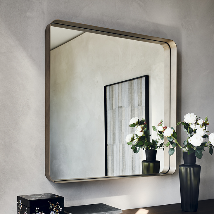 Wall mirror. Frame in titanium (GFM11) or black (GFM73) embossed lacquered steel or Brushed Bronze. Mirror is equipped with plates for both horizontal and vertical installation.