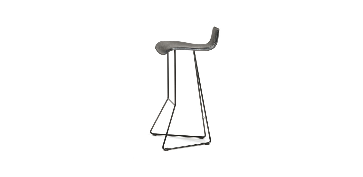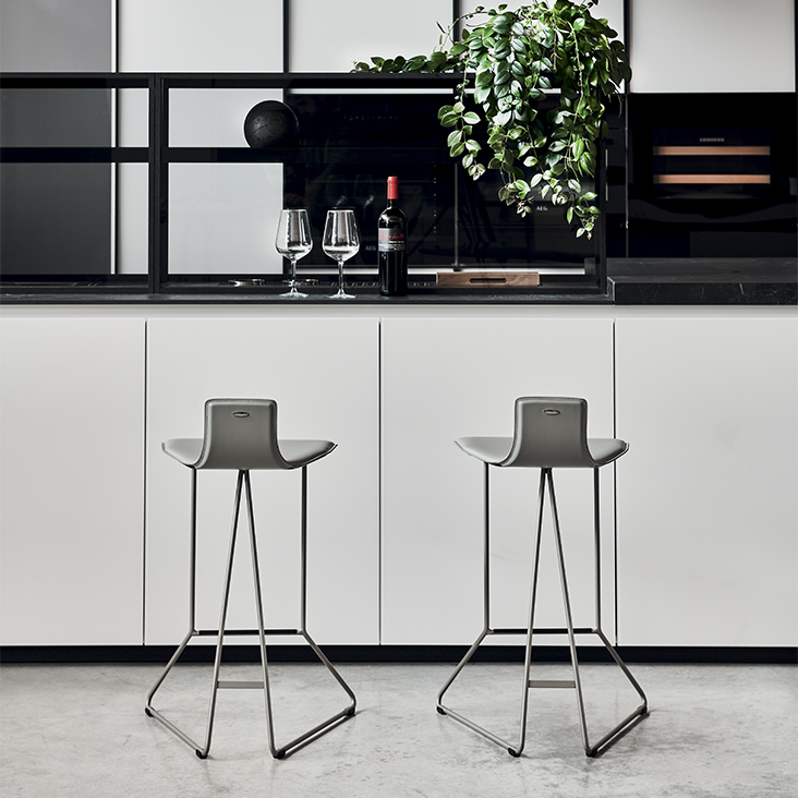Stool with steel base in white (GFM71), black (GFM73) or titanium (GFM11) embossed finish. Seat covered in leather as per sample card. Standard or in contrast stitching.