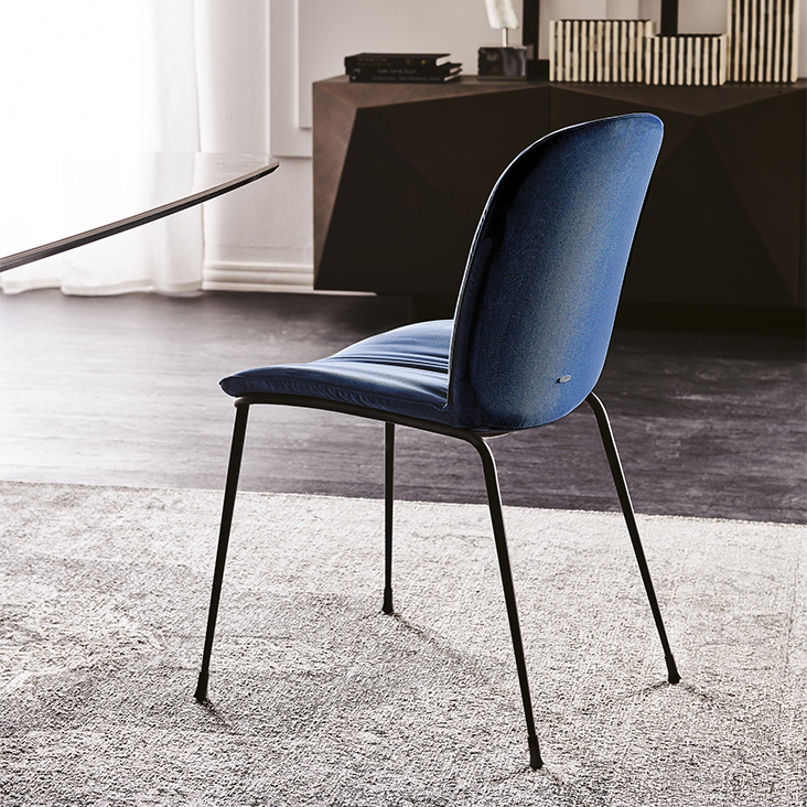 Chair with frame in titanium (GFM11), graphite (GFM69), white (GFM71) or black (GFM73) embossed lacquered steel. Cover in fabric, synthetic nubuck, micro nubuck, soft leather or synthetic leather as per sample card. The cover is not removable.