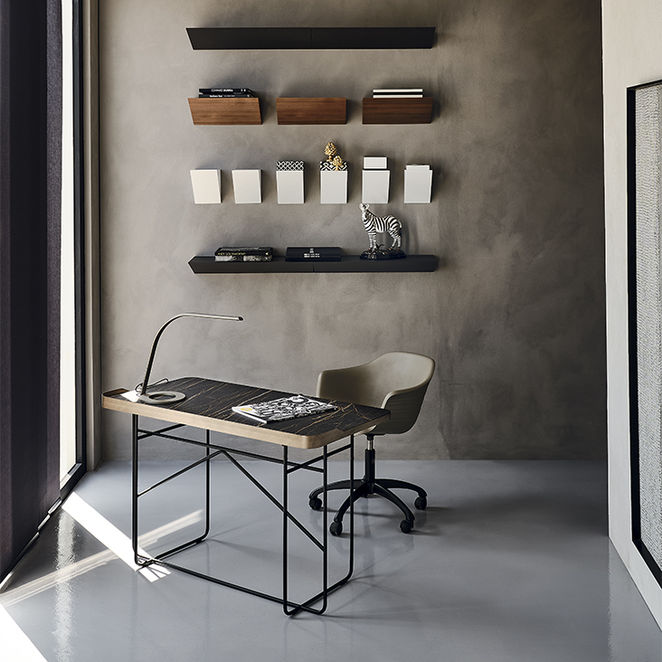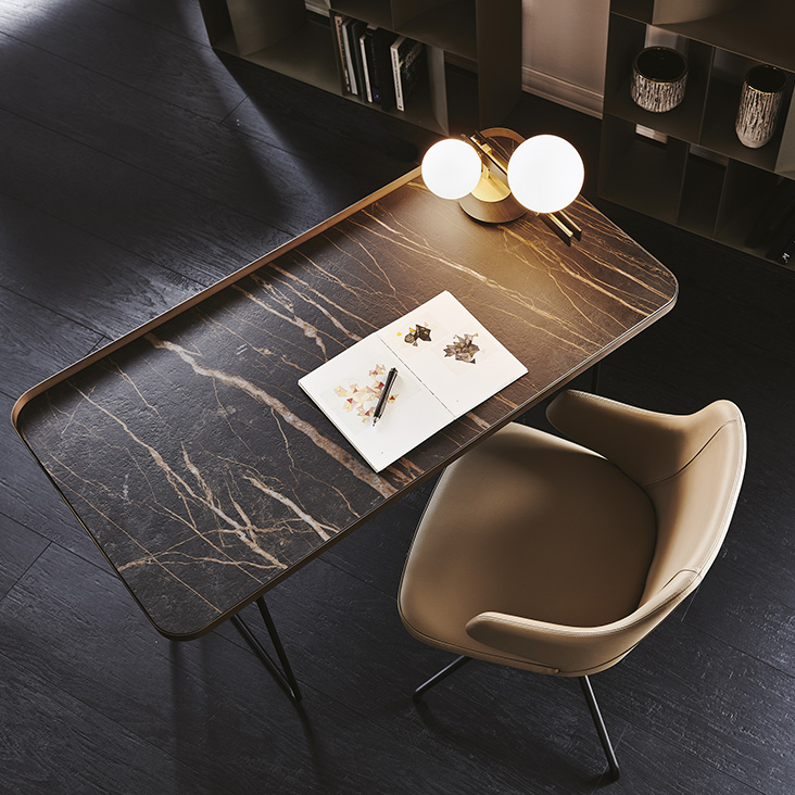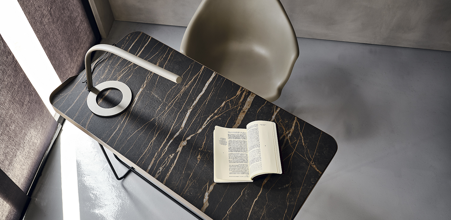 Desk with base and top frame in titanium (GFM11) or black (GFM73) embossed lacquered steel, or with base in black (GFM73) embossed lacquered steel and Brushed Bronze top frame. Top in ceramic Marmi Calacatta (KM01), Alabastro (KM02), Ardesia (KM04), matt Golden Calacatta (KM05), glossy Golden Calacatta (KM06), matt Portoro (KM07), glossy Portoro (KM08), glossy Sahara Noir (KM09), Emperador (KM10), Makalu (KM11), Breccia (KM12) or Arenal (KM13).