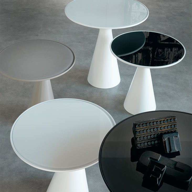 Coffee table with matt graphite (OP69), white (OP71) or titanium (M11) painted rigid polyurethane. Top in 5mm extra clear white or graphite painted tempered glass, bronze mirrored or fumé mirrored glass.