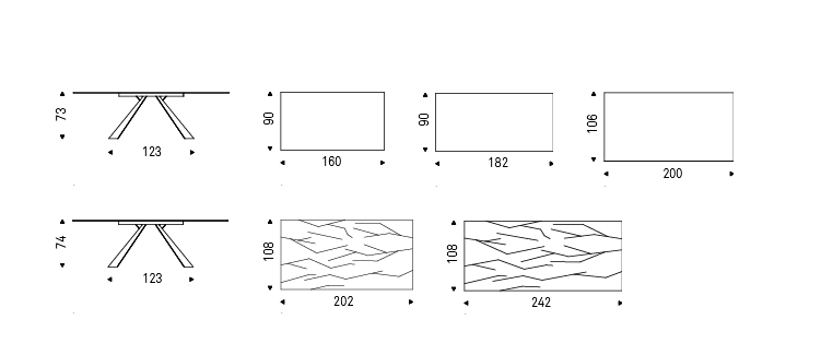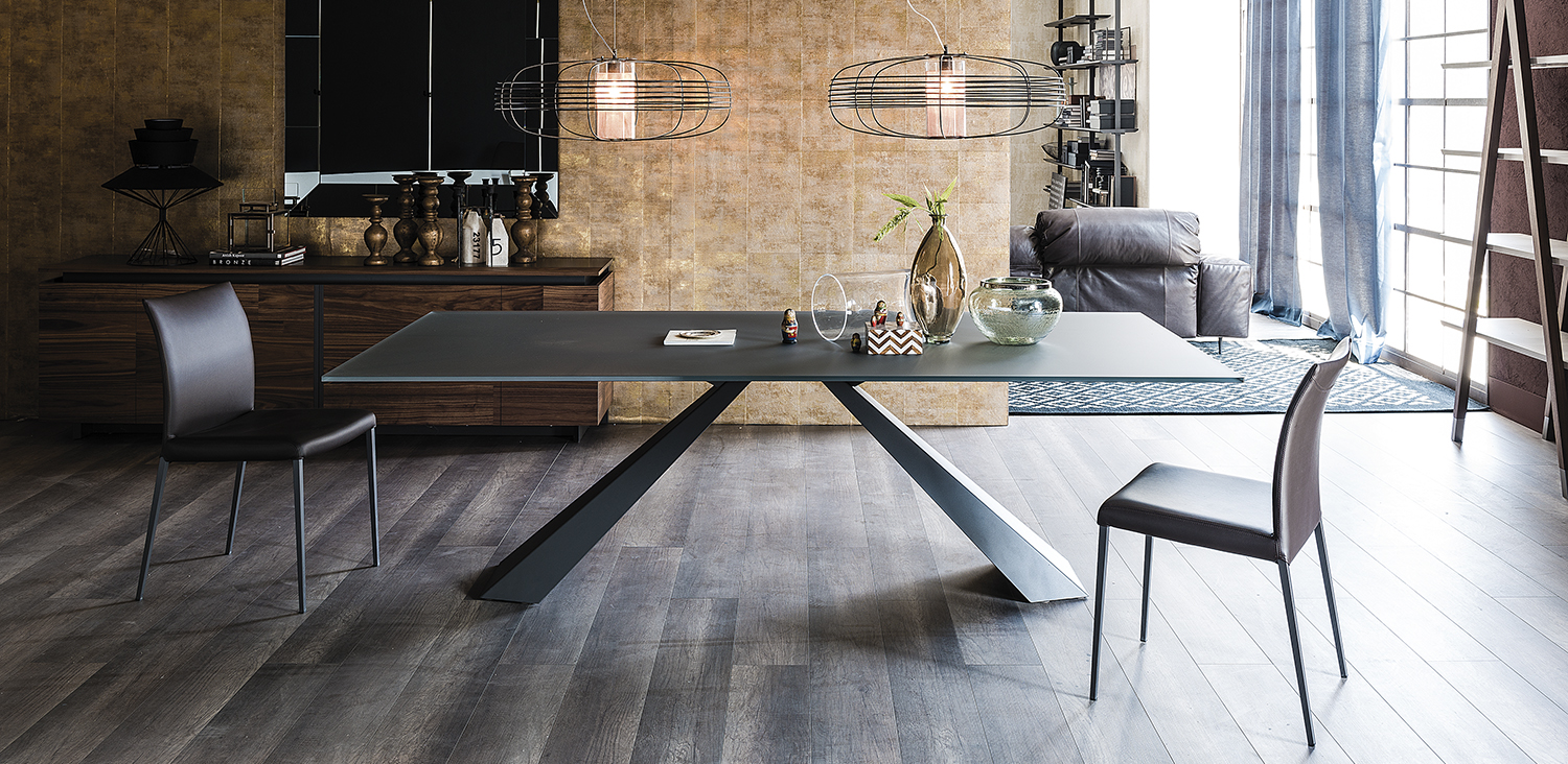 Table with base in titanium (GFM11), bronze (GFM18), graphite (GFM69), white (GFM71) or black (GFM73) embossed lacquered steel. 12mm top in graphite painted frosted extra clear glass or white Carrara (BC) or Emperador (EMP) marble.