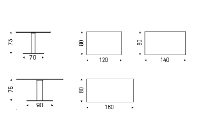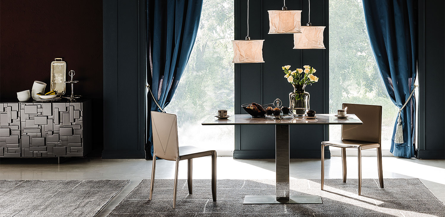 Table with base in graphite (GFM69) or white (GFM71) embossed lacquered steel or with satin stainless steel anti-marks base and polished stainless steel column. Marmi ceramic top in Calacatta (KM01), Alabastro (KM02), Ardesia (KM04), matt Portoro (KM07), glossy Portoro (KM08), Emperador (KM10), Makalu (KM11) or Arenal (KM13).