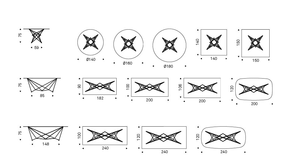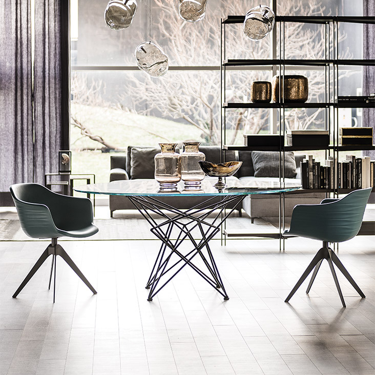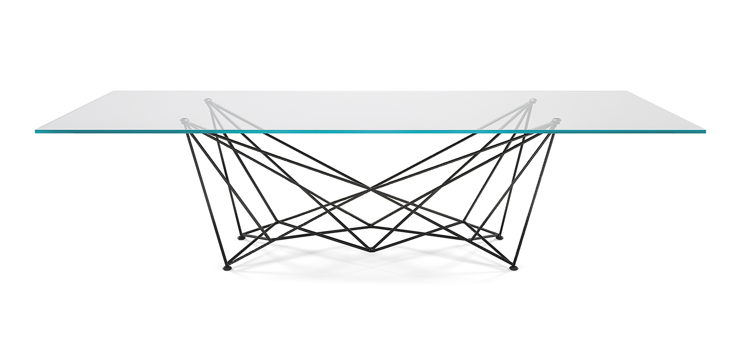 Table with titanium (GFM11), graphite (GFM69), white (GFM71) or black (GFM73) embossed lacquered steel base. Top in 15mm clear, extra clear or extra clear glass with reversed bevelled edges (rectangular version) or only bevelled (round version). Glass top 12mm on 182x90 and 200x106 versions. The top is laid on the base.