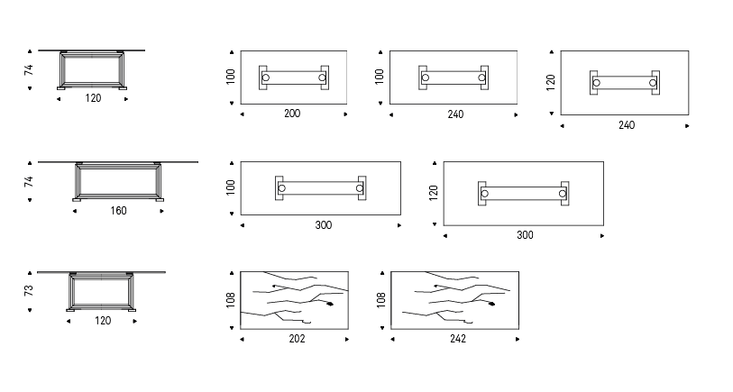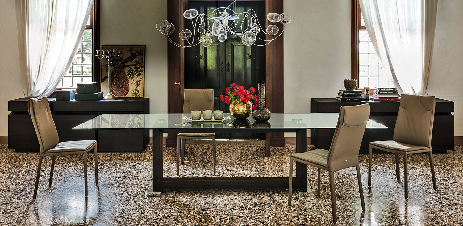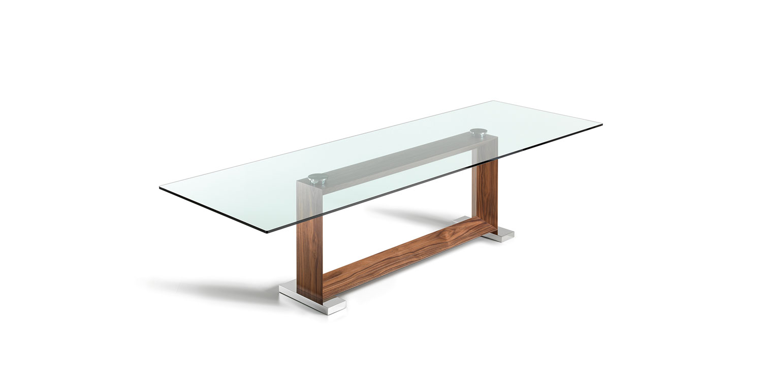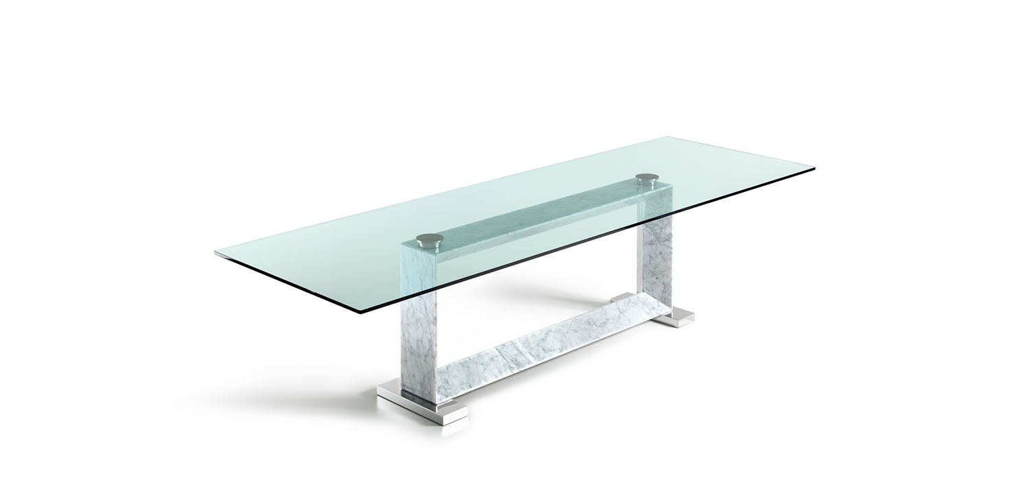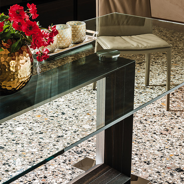 Table with base in Canaletto walnut (NC), burned oak (RB) or polished stainless steel. Feet in polished stainless steel. Top with plates in 15mm tempered clear glass, extra clear glass or in white Carrara marble (BC). The marble top is laid on the base. Small reflection irregularities on the stainless steel base are due to manual processing