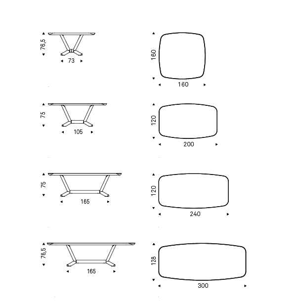 Table with base in titanium (GFM11), bronze (GFM18), graphite (GFM69) or black (GFM73) embossed lacquered steel, Brushed Bronze or Brushed Grey. Top in ceramic Marmi Calacatta (KM01), Alabastro (KM02), Ardesia (KM04), matt Golden Calacatta (KM05), glossy Golden Calacatta (KM06), matt Portoro (KM07), glossy Portoro (KM08), glossy Sahara Noir (KM09), Emperador (KM10), Makalu (KM11), Breccia (KM12) or Arenal (KM13) with Brushed Bronze or Brushed Grey lacquered and rounded lower profile. 6cm thick wooden top on 160x160 and 300x128 versions and 5cm on 200x120 and 240x120 versions.