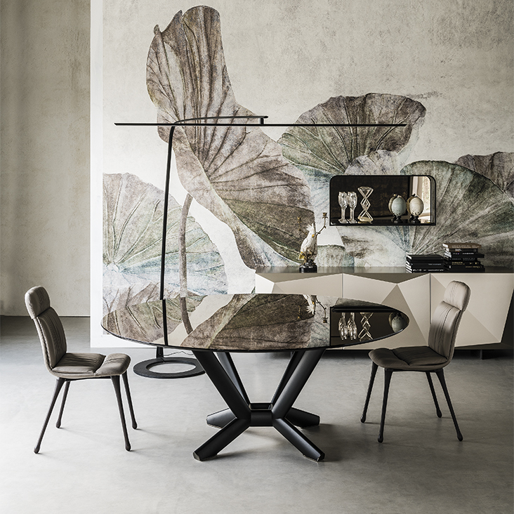 Table with base in titanium (GFM11), bronze (GFM18), graphite (GFM69) or black (GFM73) embossed lacquered steel, Brushed Bronze or Brushed Grey. 15 mm top in clear or extra clear glass with bevelled edges. The top is laid on the base.