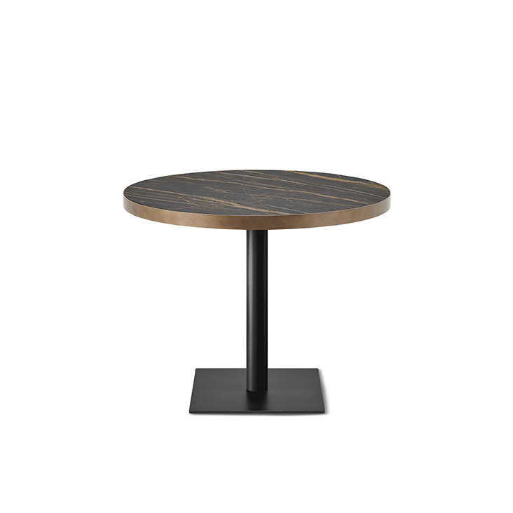 Bistrot table with base in titanium (GFM11), graphite (GFM69) or black (GFM73) embossed lacquered steel and top frame in titanium (GFM11), graphite (GFM69) or black (GFM73) embossed lacquered steel or Brushed Bronze. Marmi Calacatta (KM01), Alabastro (KM02), Ardesia (KM04), matt Portoro (KM07), glossy Portoro (KM08), Emperador (KM10), Makalu (KM11) or Arenal (KM13) ceramic top.
