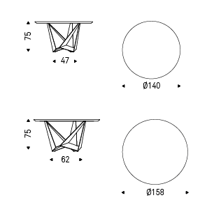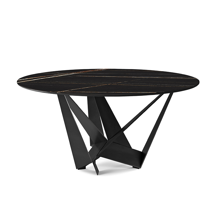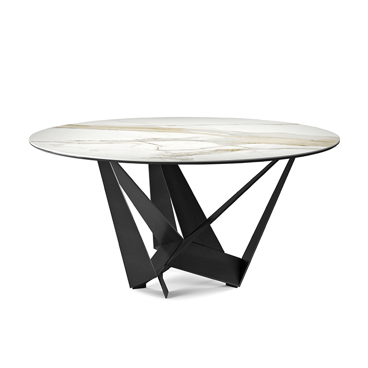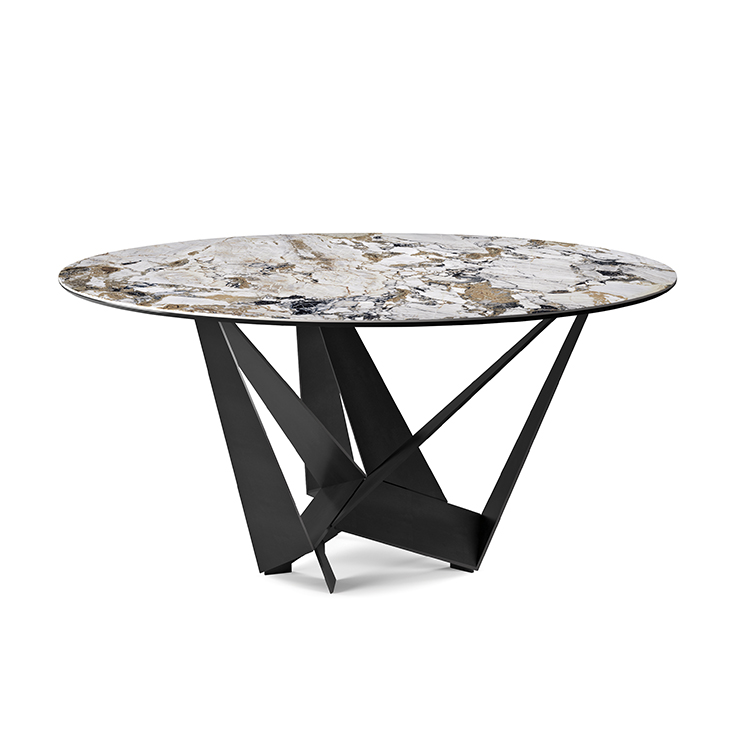 Table with base in titanium (GFM11), bronze (GFM18), graphite (GFM69), white (GFM71) or black (GFM73) embossed lacquered steel, Brushed Bronze or Brushed Grey. Top in ceramic Marmi in Calacatta (KM01), Alabastro (KM02), Ardesia (KM04), matt Golden Calacatta (KM05), glossy Golden Calacatta (KM06), matt Portoro (KM07), glossy Portoro (KM08), glossy Sahara Noir (KM09), Emperador (KM10), Makalu (KM11), Breccia (KM12) or Arenal (KM13). Optional central swiveling tray Lazy Susan.
