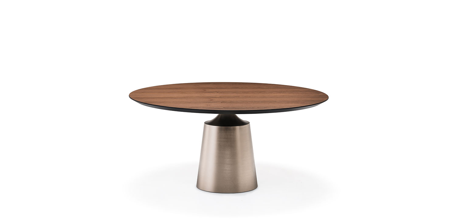 Table with base in graphite (GFM69), white (GFM71), black (GFM73) embossed lacquered steel or satin titanium steel (11). Top in Canaletto walnut (NC) or burned oak (RB). Glazes on the satin titanium base are due to the handmade work. Optional central swiveling tray Lazy Susan.