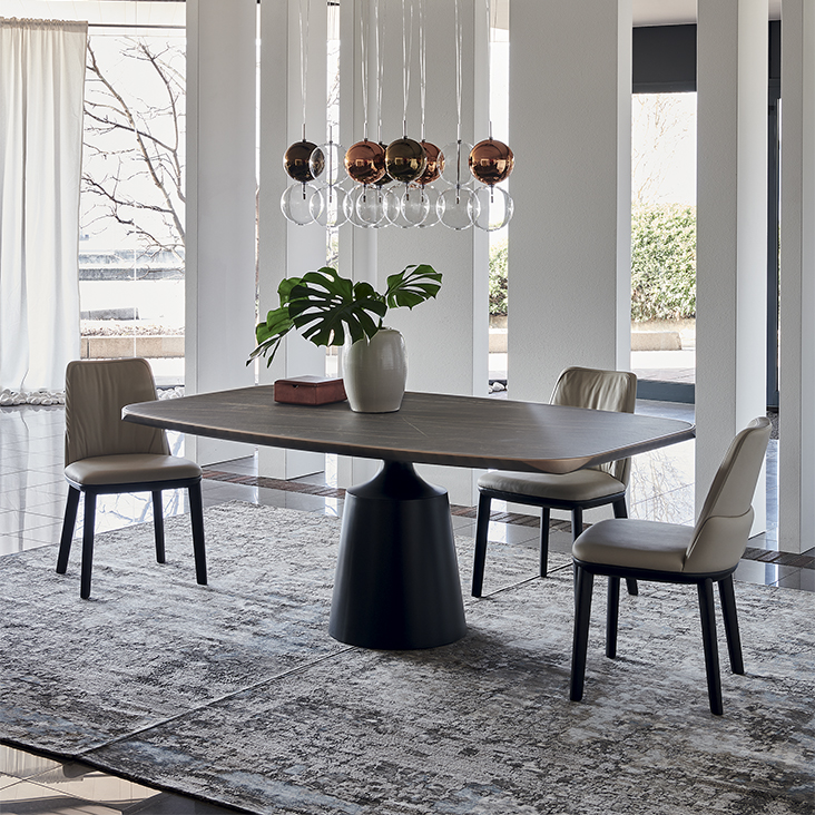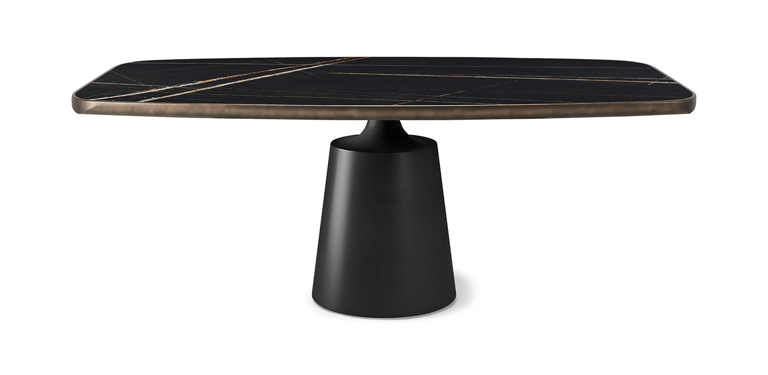 Table with base in graphite (GFM69), white (GFM71), black (GFM73) embossed lacquered steel or satin titanium steel (11). Top in ceramic Marmi Calacatta (KM01), Alabastro (KM02), Ardesia (KM04), matt Golden Calacatta (KM05), glossy Golden Calacatta (KM06), matt Portoro (KM07), glossy Portoro (KM08), glossy Sahara Noir (KM09), Emperador (KM10), Makalu (KM11), Breccia (KM12) or Arenal (KM13) with Brushed Bronze or Brushed Grey lacquered and rounded lower profile.