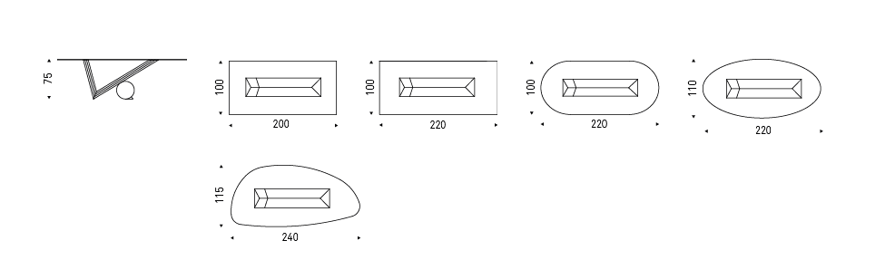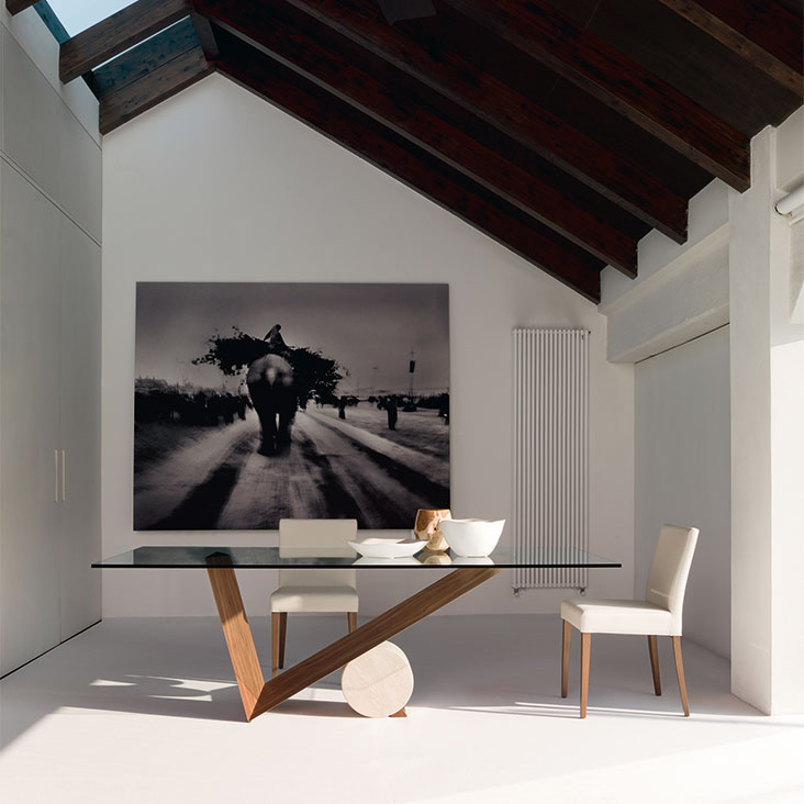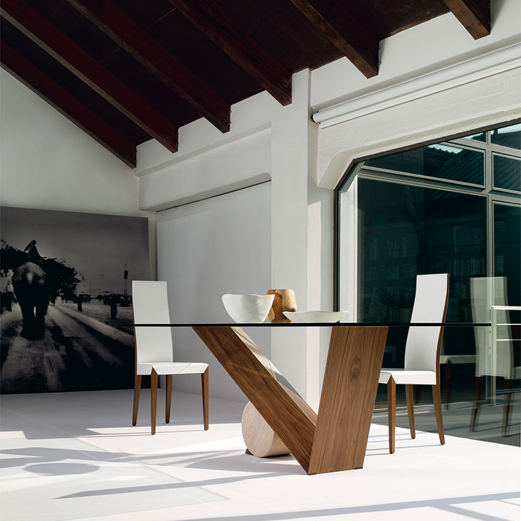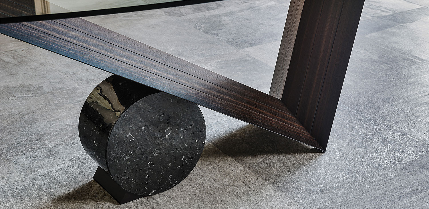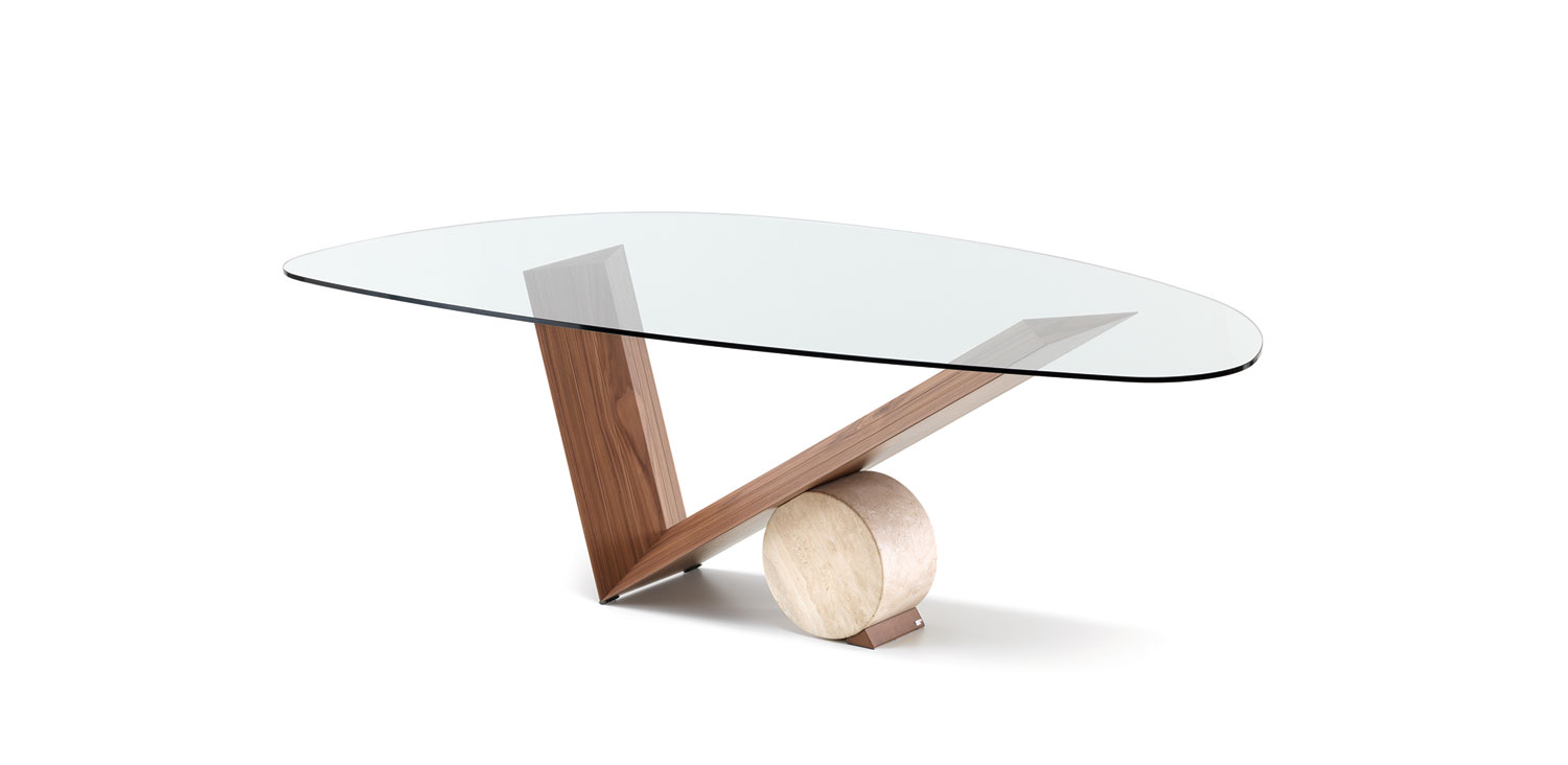 Table in Canaletto walnut (NC) or burned oak (RB) and cylinder in Travertine (TN), black Marquina (NM) or white Carrara (BC) marble. Top in 15mm clear glass, laid on the base. The shaped top 240x115 is 12mm thick.