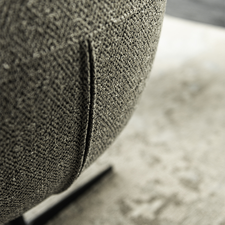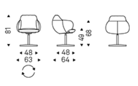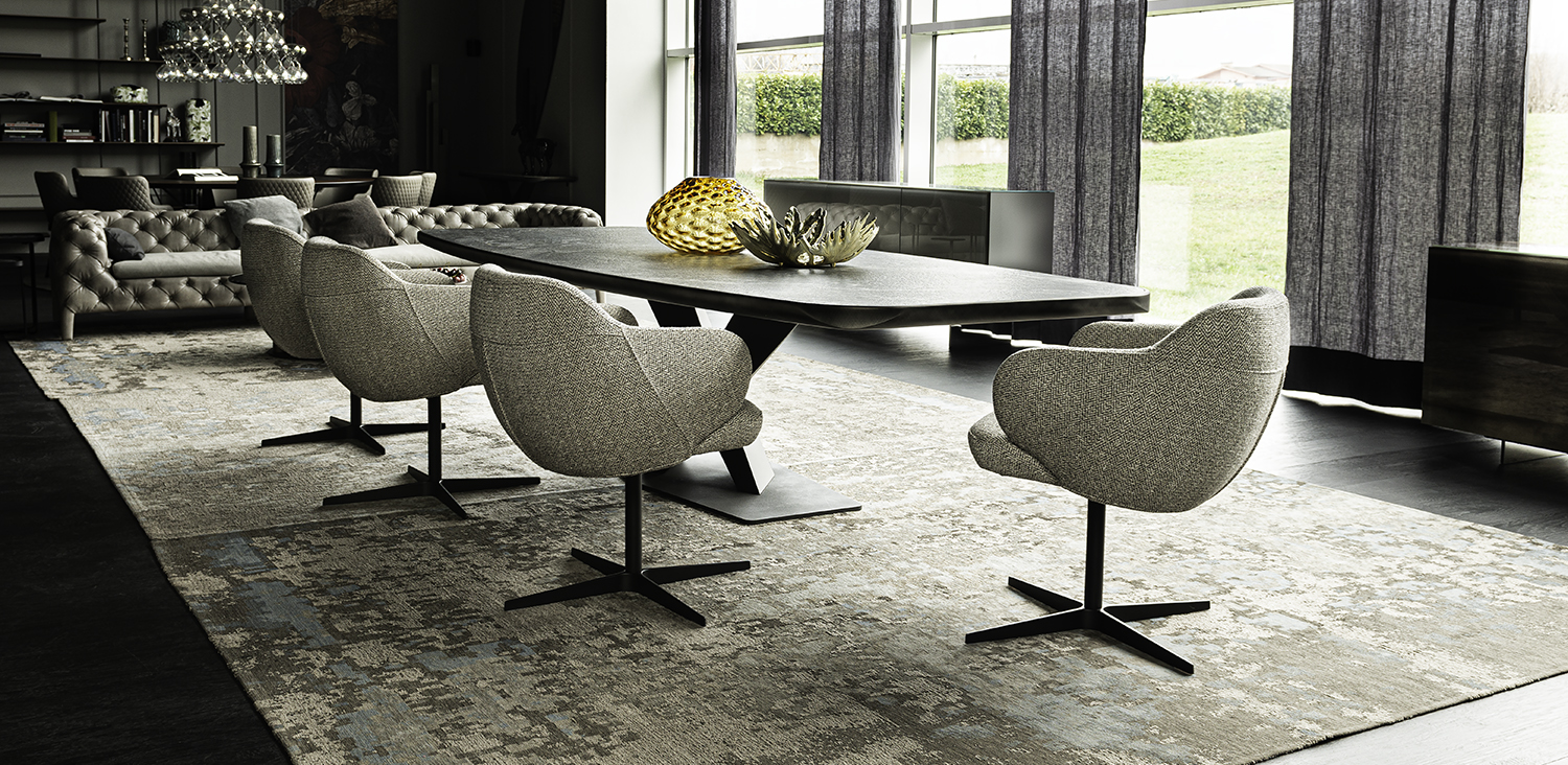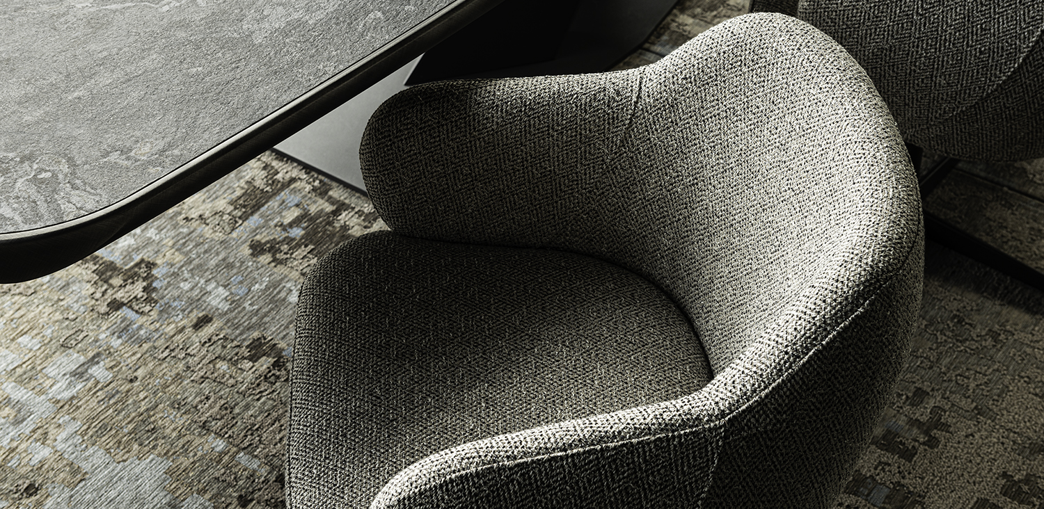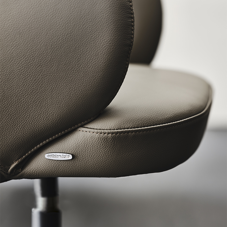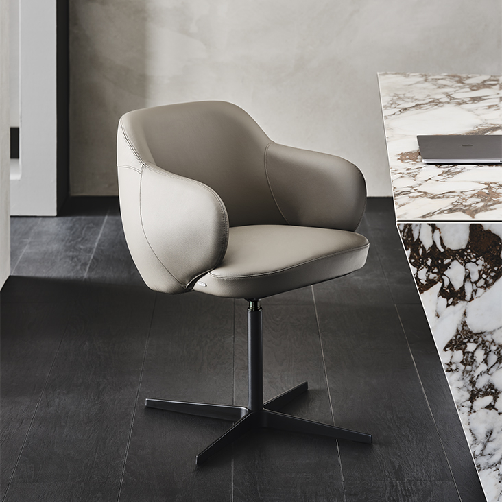 Swiveling chair with 4 spokes base in titanium (GFM11), bronze (GFM18), graphite (GFM69) or black (GFM73) embossed lacquered steel. Seat and back upholstered in fabric, synthetic nubuck, synthetic leather or soft leather as per sample card. The cover is not removable.