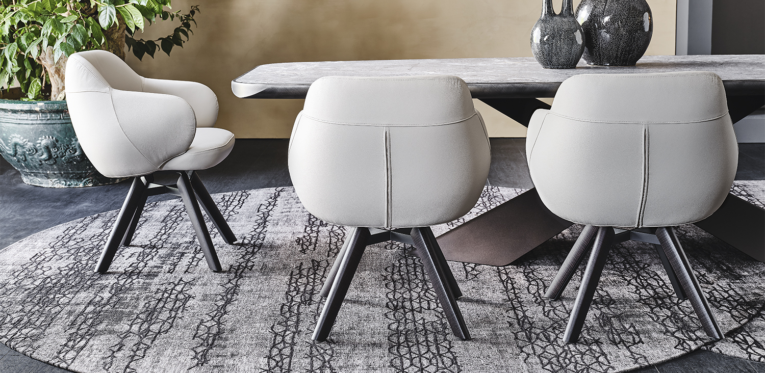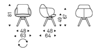 Swiveling chair with graphite (GFM69) or white (GFM71) embossed lacquered steel frame. Feet in Canaletto walnut stained ashwood (frNC), burned oak stained ashwood (frRB) or open pore matt black (fr73) painted. Seat and back upholstered in fabric, synthetic nubuck, synthetic leather or soft leather as per sample card. The cover is not removable.