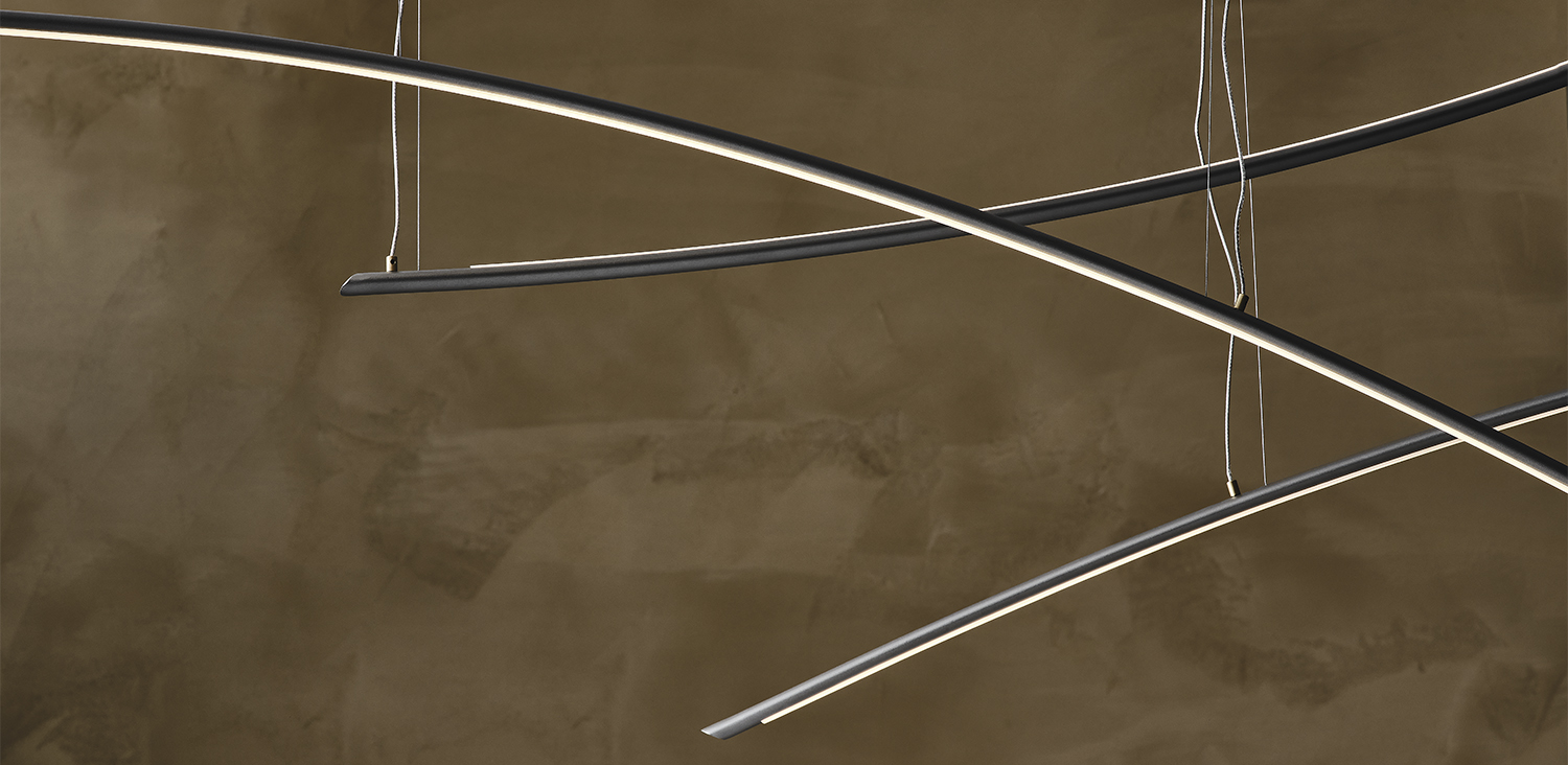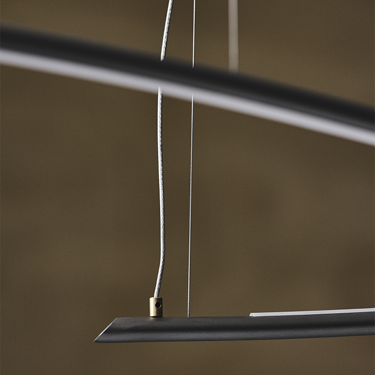 Ceiling lamp in titanium (GFM11) embossed lacquered steel frame. Ceiling plate in titanium (GFM11) and black (GFM73) embossed lacquered steel. Led lights. Optional: remote control and dimmer.