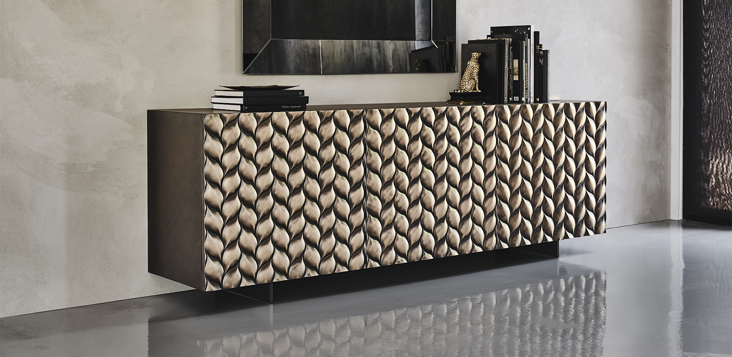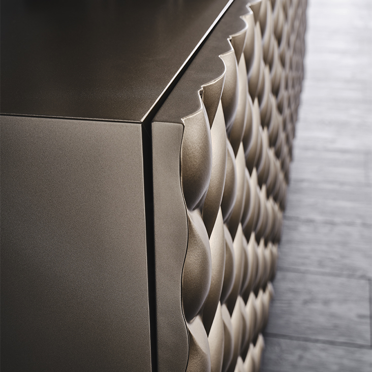 Sideboard 2 or 3 doors in matt graphite (OP69) or titanium (M11) lacquered wood, Brushed Bronze or Brushed Grey. Polished stainless steel feet or graphite (OP69) varnished. Internal clear glass shelves. Optional: internal drawer in each door.