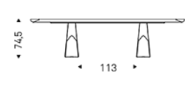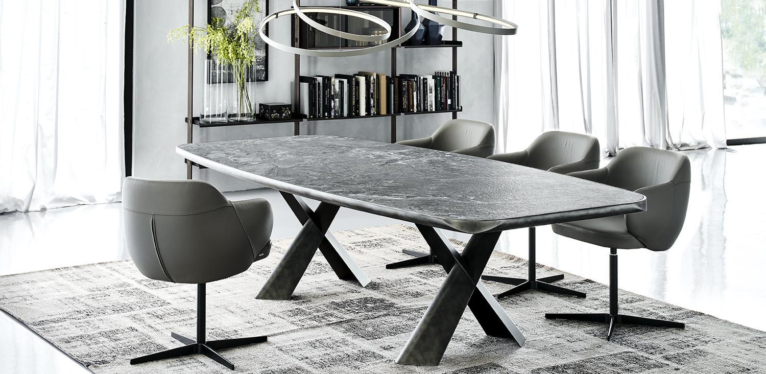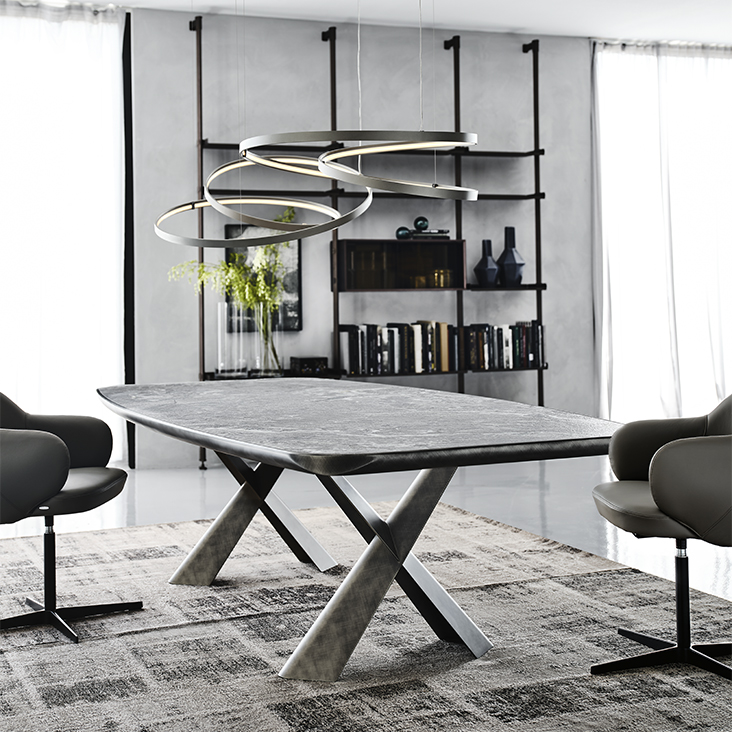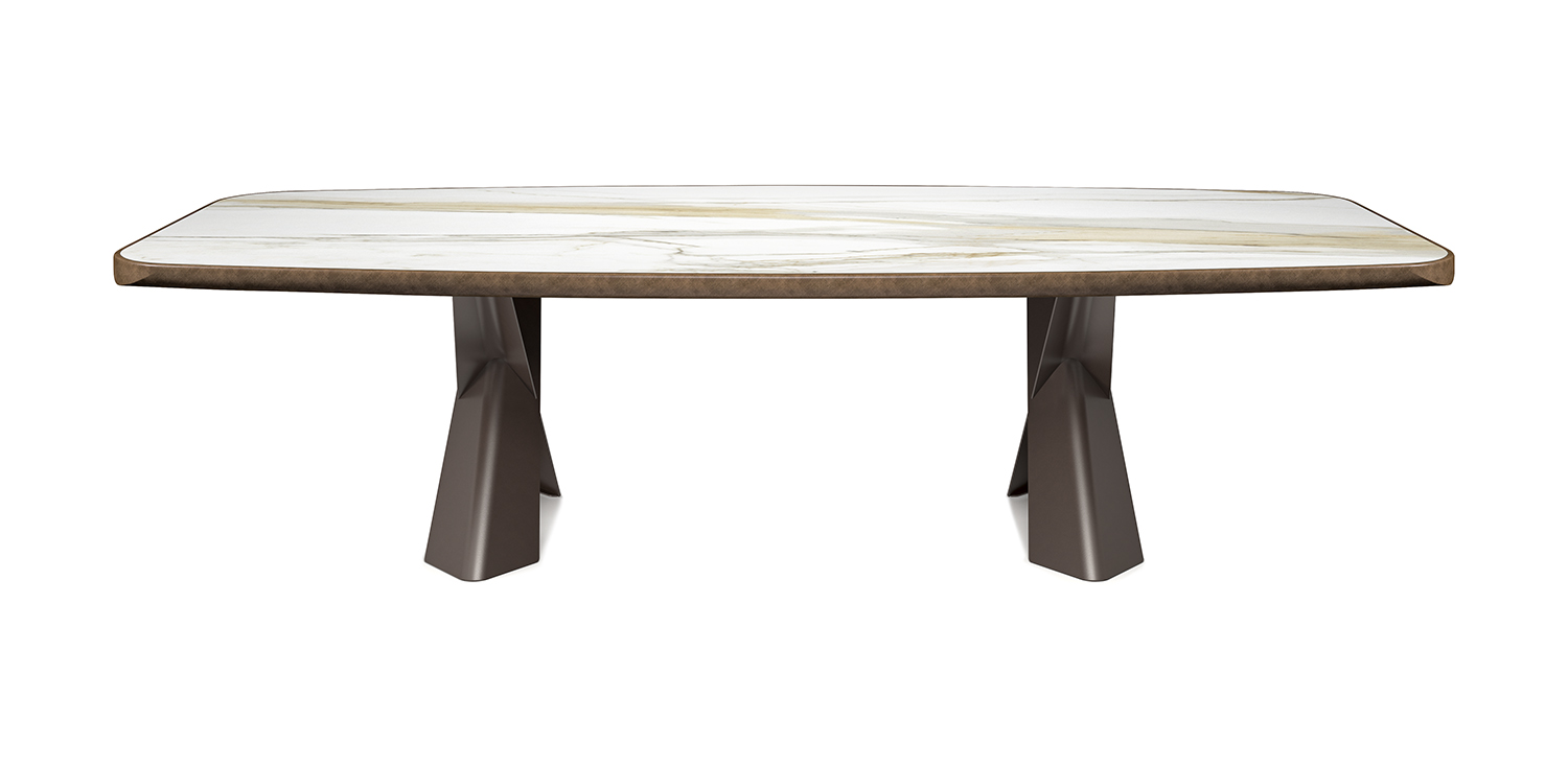 Table with base in titanium (GFM11), bronze (GFM18), graphite (GFM69) or black (GFM73) embossed lacquered steel, Brushed Bronze or Brushed Grey. Top in ceramic Marmi Alabastro (KM02), Supreme (KM03), Ardesia (KM04), matt Golden Calacatta (KM05), glossy Golden Calacatta (KM06), matt Portoro (KM07), glossy Portoro (KM08), glossy Sahara Noir (KM09), Emperador (KM10), Makalu (KM11), Breccia (KM12) or Arenal (KM13) with Brushed Bronze or Brushed Grey lacquered and rounded lower profile. 6cm thick top on 300x128 version and 5cm on 240x120 version.