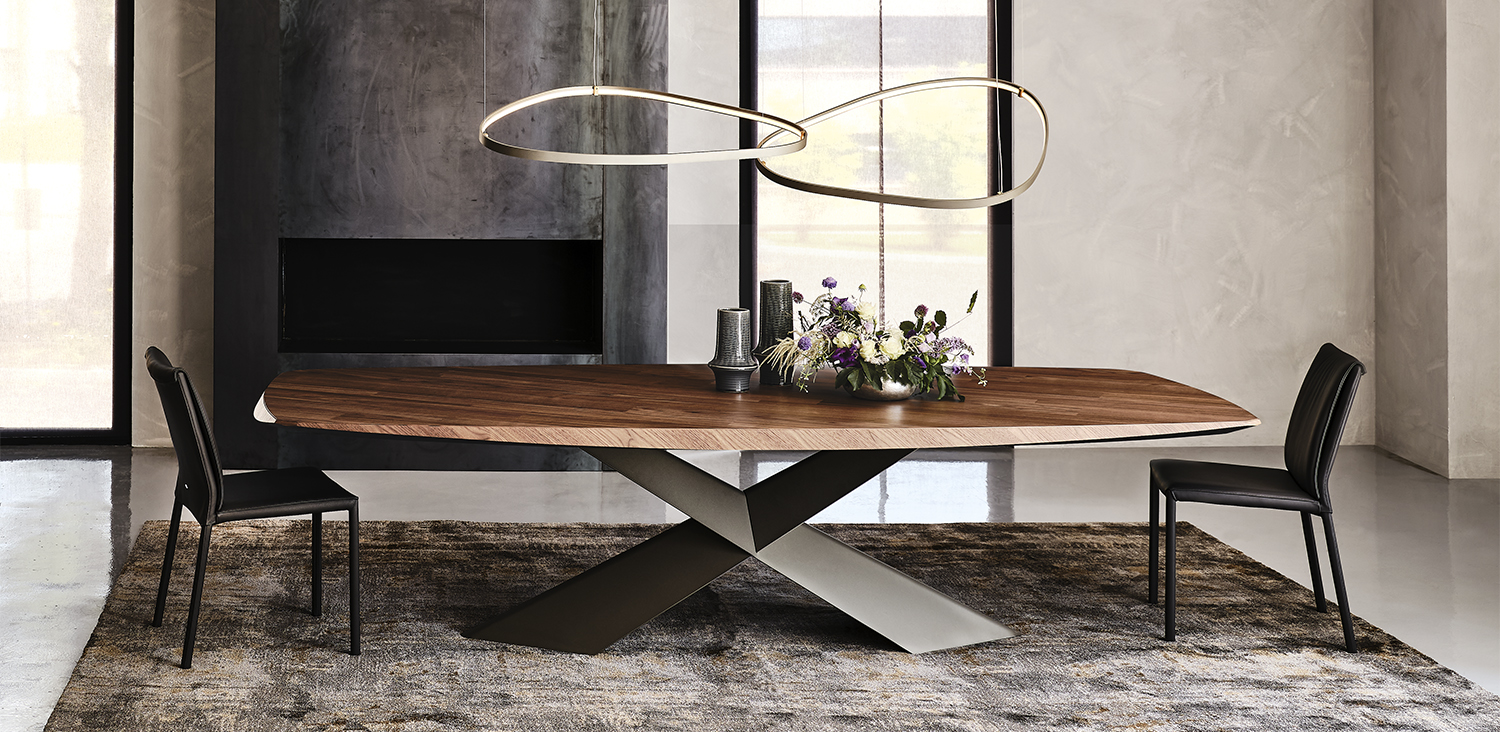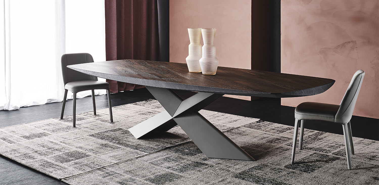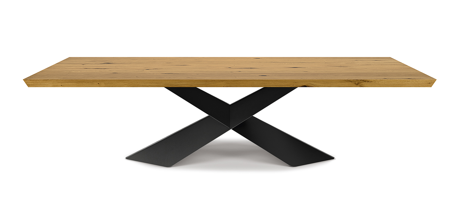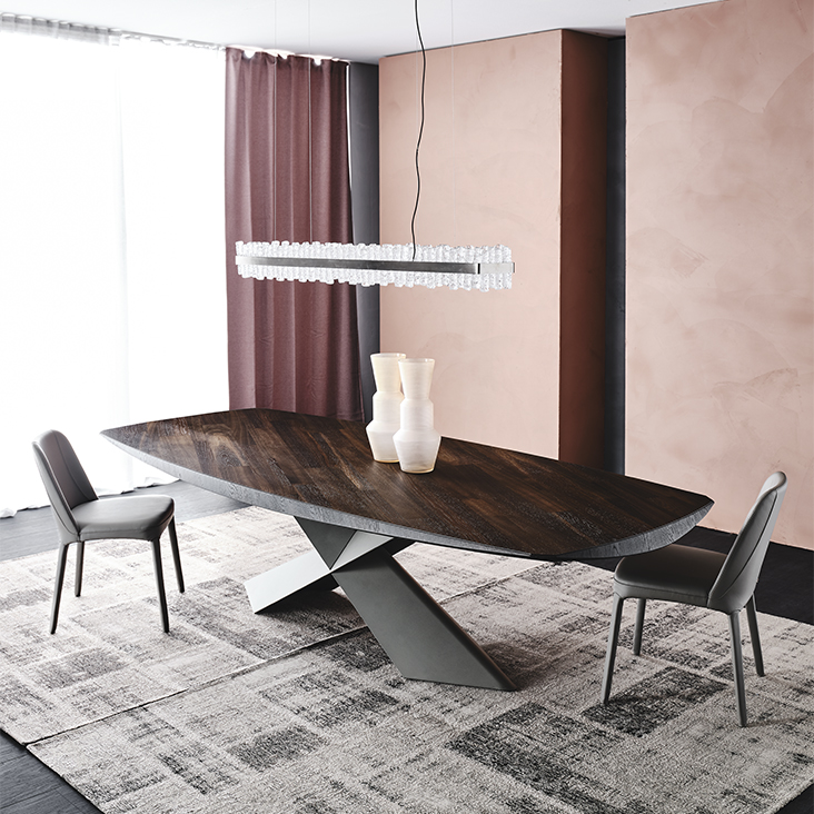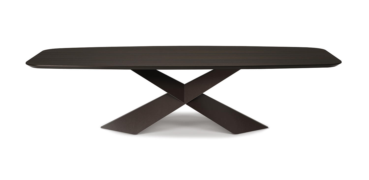 Table with base in titanium (GFM11), bronze (GFM18), graphite (GFM69) or black (GFM73) embossed lacquered steel, Brushed Bronze or Brushed Grey. Version "A": top with angled edges in Canaletto walnut (NC), Heritage oak (HR), burned oak (RB) or natural oak (RN). Version "B": barrel top with angled edges in Canaletto walnut (NC) or burned oak (RB). Version "C": top in Canaletto walnut (NC) with Brushed Grey lacquered and rounded lower profile or Elm open pore matt black (OLM73) with Brushed Bronze lacquered and rounded lower profile. Version "S": top with irregular solid wood edges in Canaletto walnut (NC), burned oak (RB) or natural oak (RN). "Masterwood" version: boat shaped in Canaletto walnut (NC) or Burned Oak (RB) made of diagonal wood planks of different sizes. Oblique and rounded edges.
