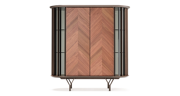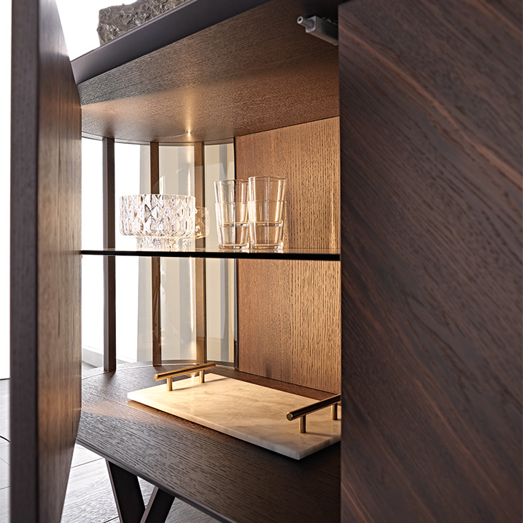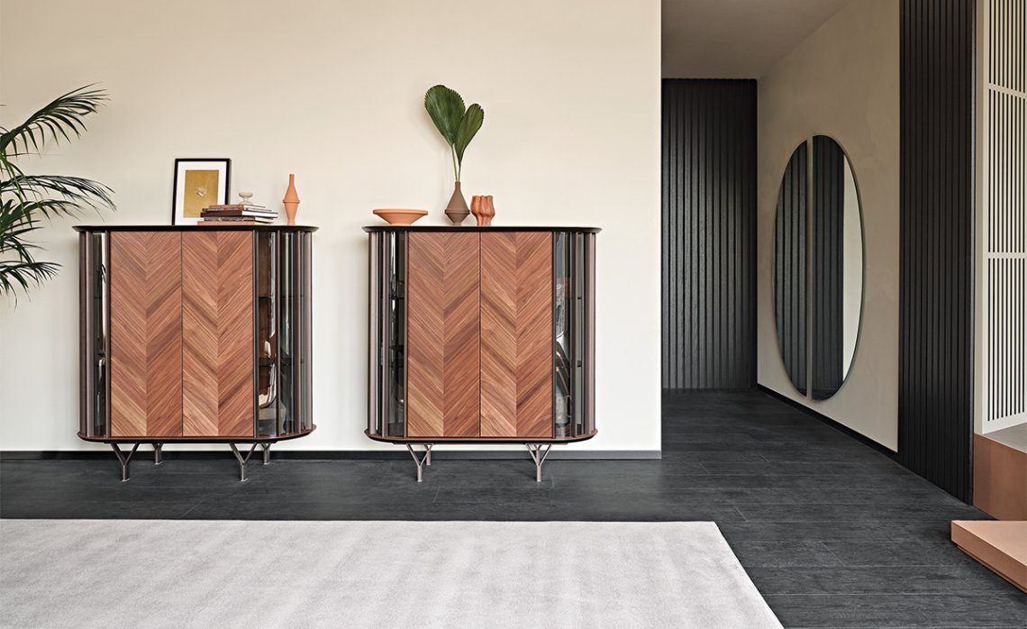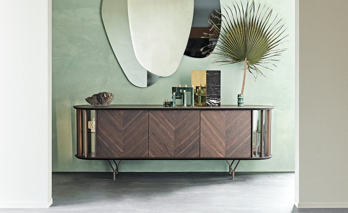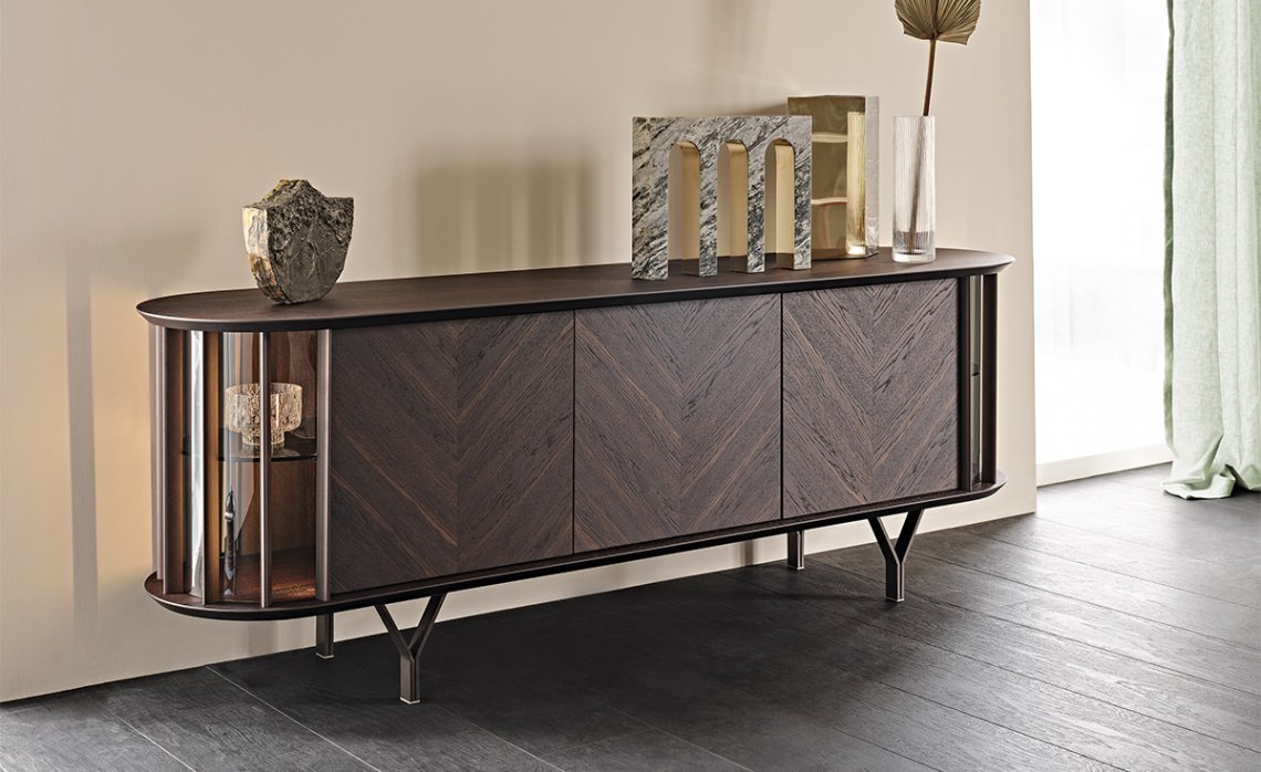 The curved transparent glass sides are interspersed with vertical metal inserts, which give rhythm to the composition and allow a glimpse of the internal glass shelves. But the real detail that differentiates it is the refined foot, composed of two metal elements forming a Y that rests gracefully on the ground. The wooden doors are made with diagonal slats that highlight the attractive natural grain of the wood. This modern sideboard is made with 2 or 4 doors, to adapt naturally to any space in the house.