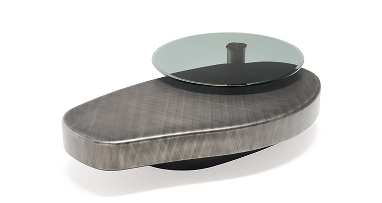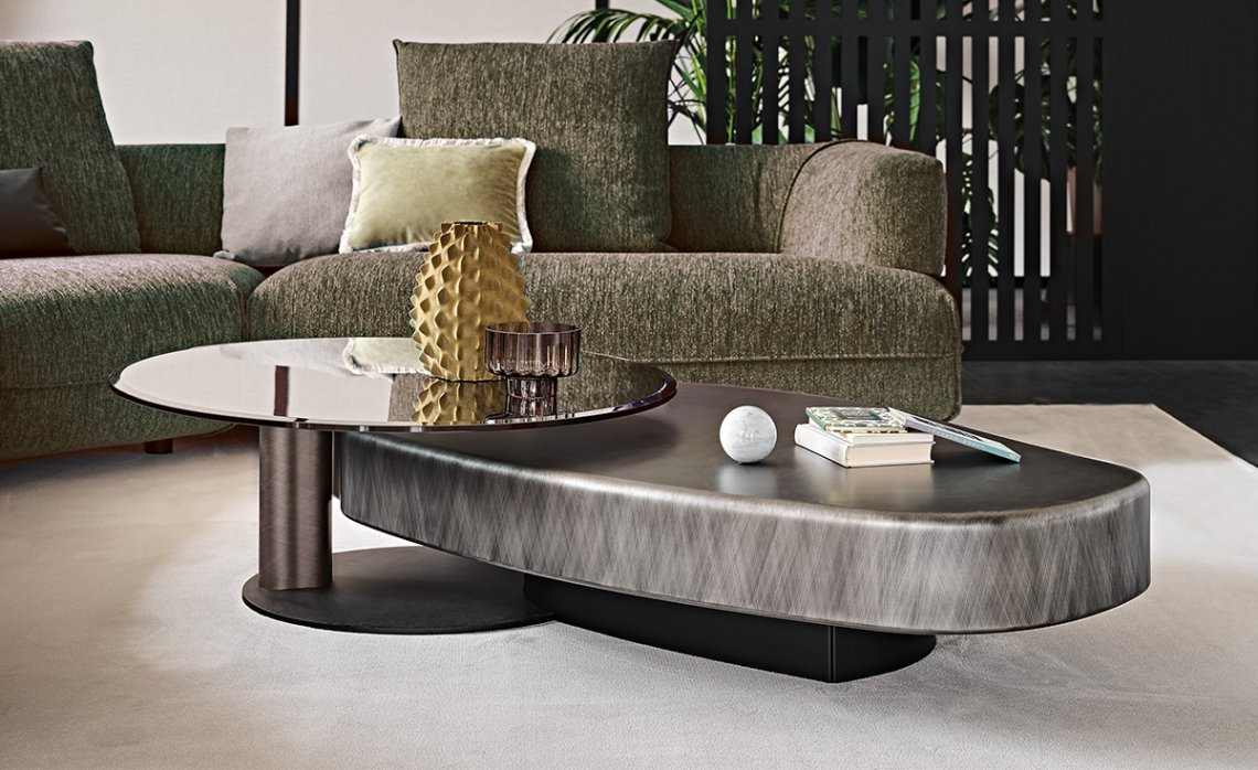 This modern coffee table comes in two models, but a total of five variants. Arena is a round model that can be complemented by one or two rotating round glass coffee tables that flank the main top: Arena Bond and Arena Double Bond. The elongated model is Arena Long, also available in the Arena Long Bond version. The column of the Bond glass coffee table is lacquered in the same hand-worked finish as the main top.