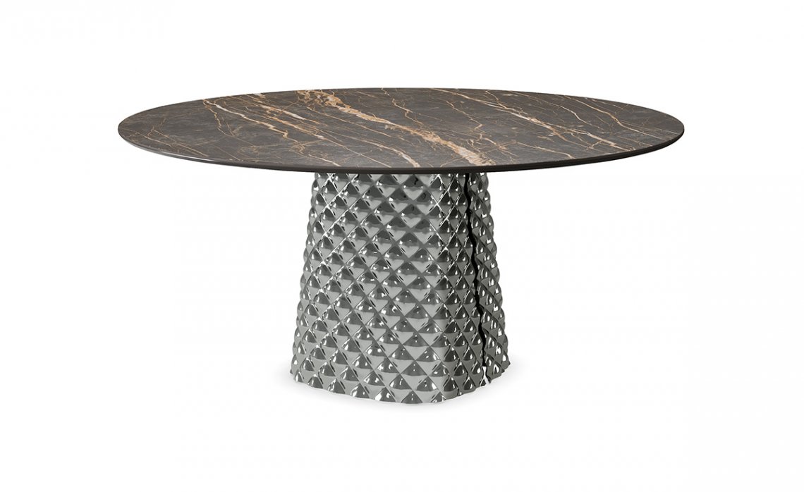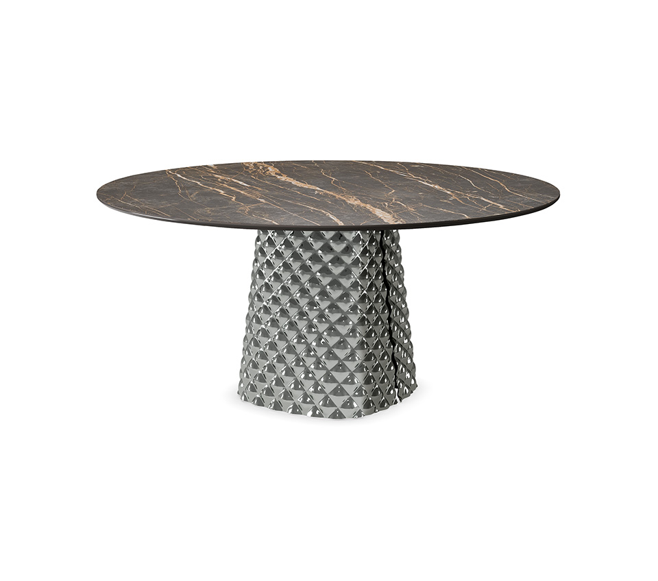 The central base consists of two finely worked plates of couture mirrored glass. The table creates a play of soft reflections, in which the surrounding objects and light sources reverberate. The glass is shaped with an unprecedented technique that gives the surface a three-dimensional effect like quilting on fabric. The table tops of the Atrium line range from wood to ceramics up to round tables in wood and ceramics combined.