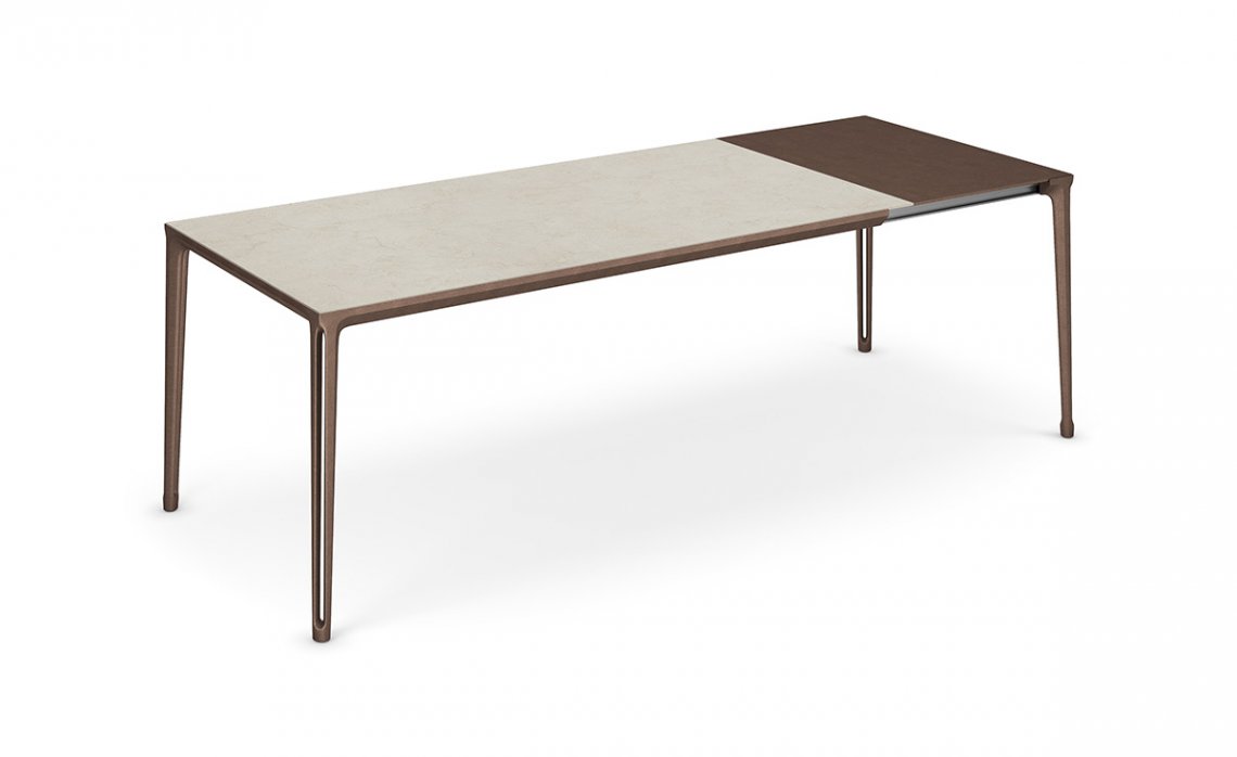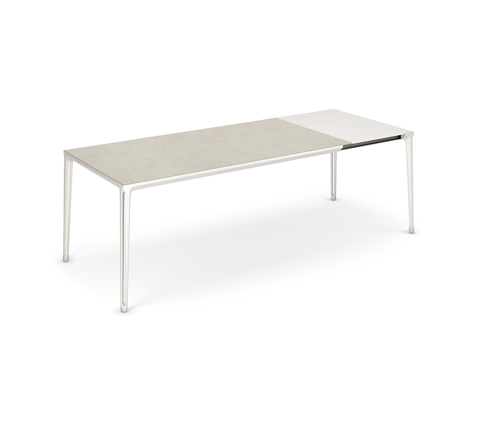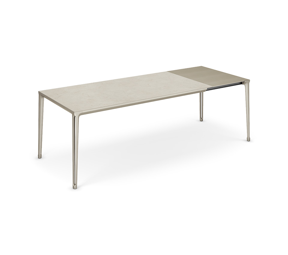 Boulevard is a design dining table with a disarming simplicity. It fits into a residential setting with ease and contemporary charm. The legs have a vertical cavity, enhanced by sophisticated varnished finishes chosen from among different intense or bright shades. The same finish rigorously frames the top, available in glass or ceramic.