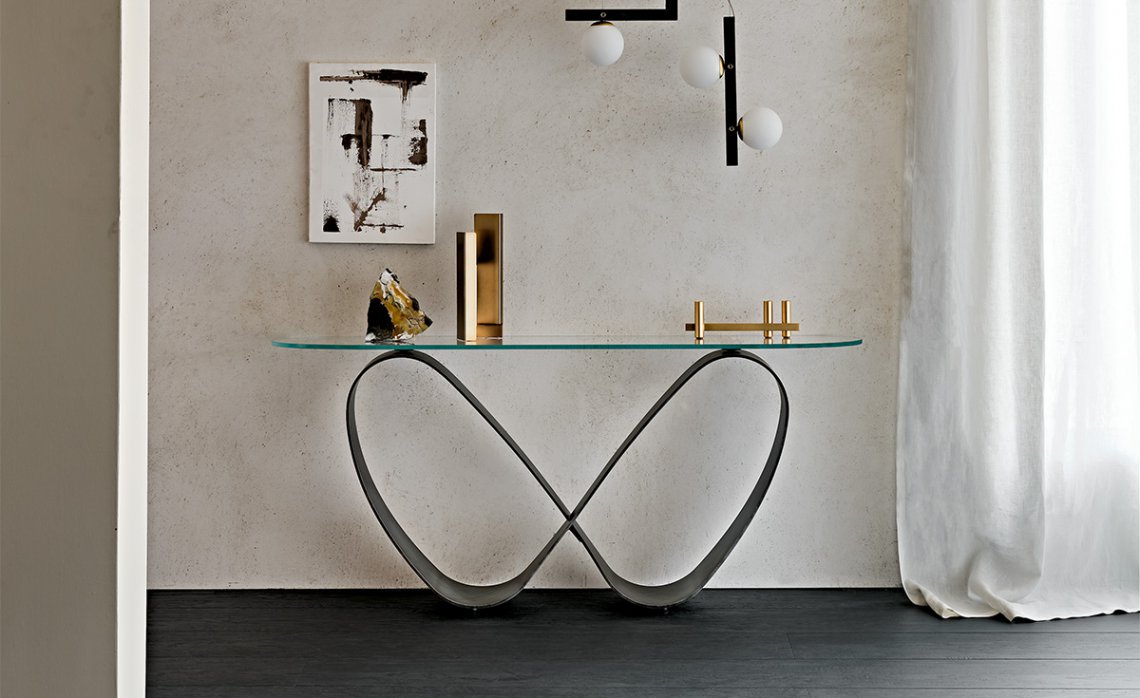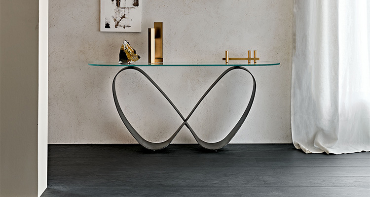 It includes an elegant glass table, a ceramic top version and a seductive design console .The steel base of the Butterfly design tables becomes the star of the modern dining room with a sculpture-like style and a reference to the elegance of nature. The glass top rests on the base, its fragile appearance creating a contrast with the bold and revolutionary combination of curves and edges.