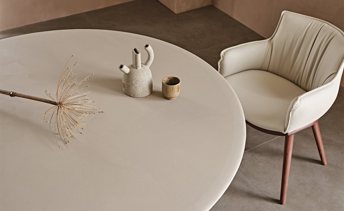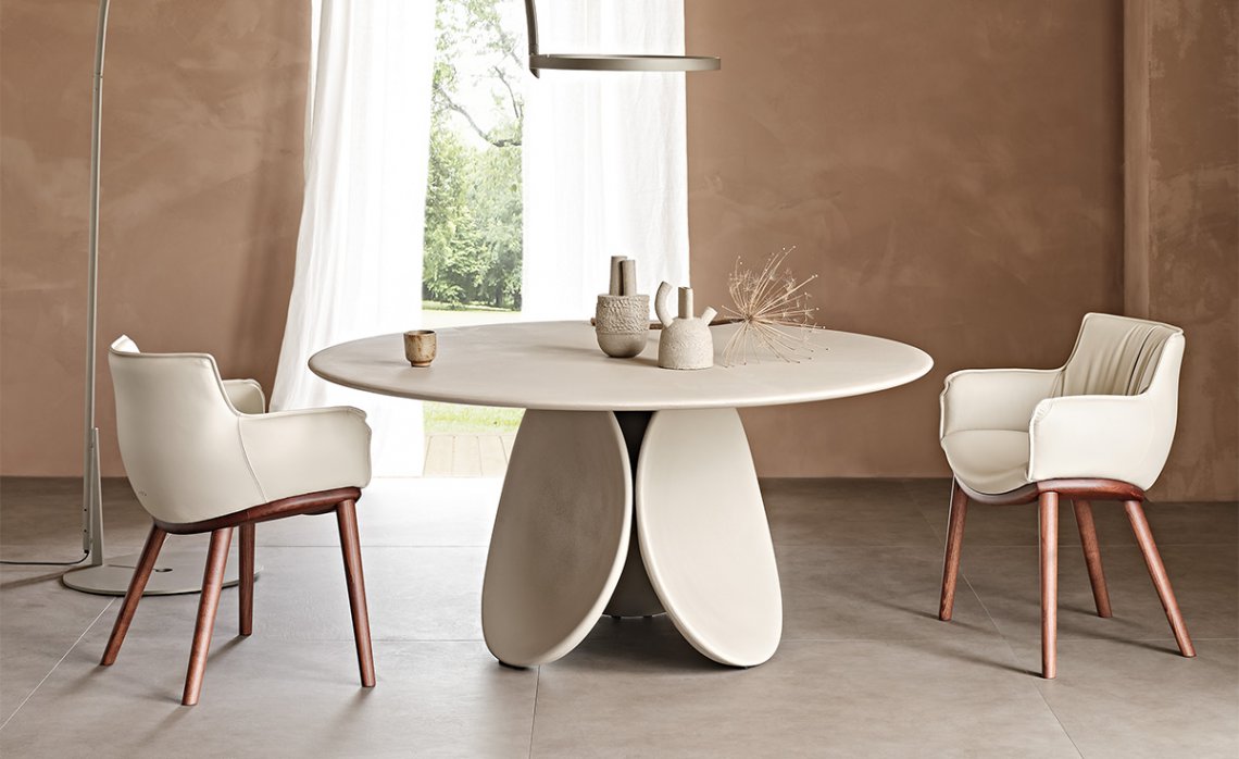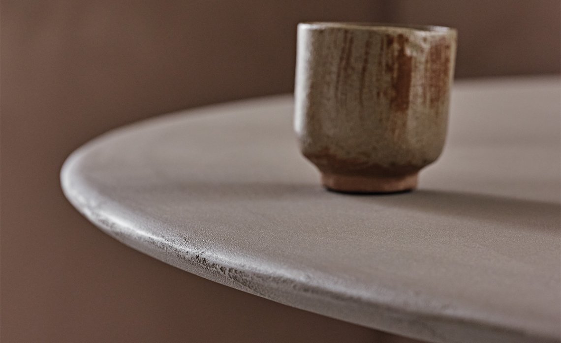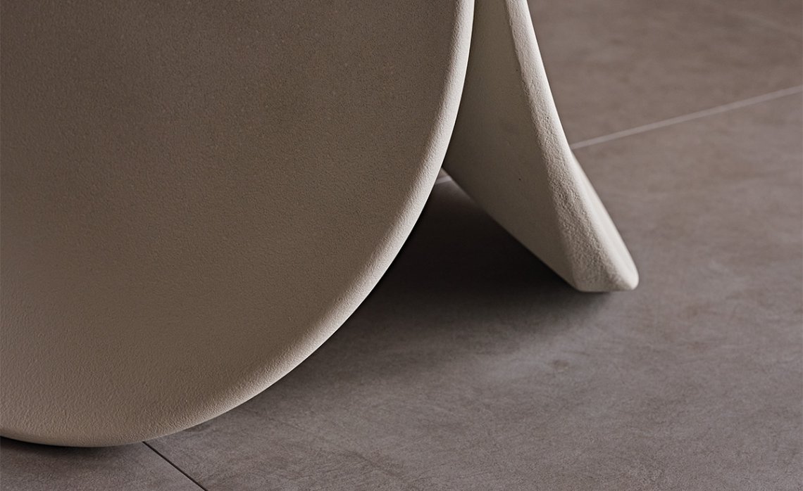 The design of the Maxim table-sculpture stems from the seamless link between its shape, consisting of three petals, and the material it is made from. It derives from manual craftsmanship and a cold moulding technique, which does not involve exploiting energy resources. The industrialised processes are only to support the high artisan component of the manual phases of pouring the liquid cement and the finishing. The base of this modern table is in fact finished in clay, with earthy and natural shades.