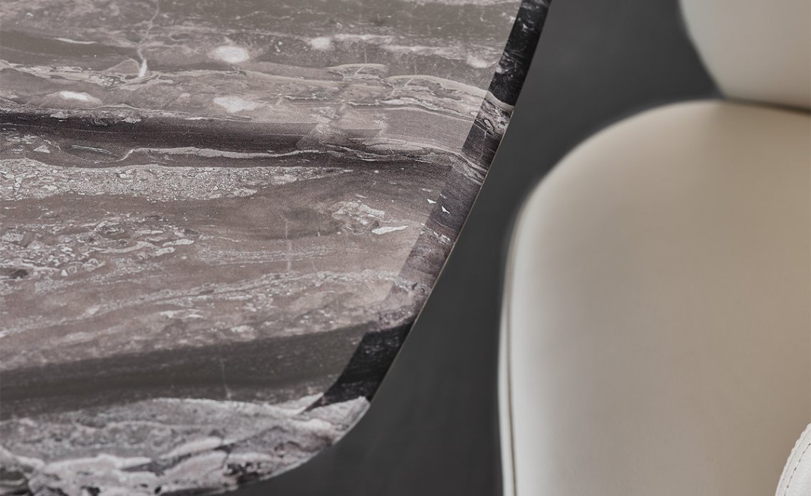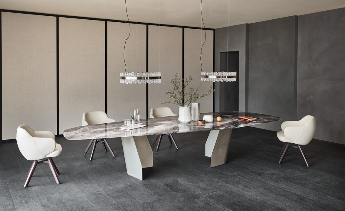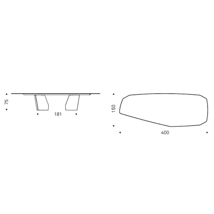 The glass top extends 4 metres in an irregular shape with rounded corners. This modern glass table seems to follow no geometric rules, yet the result is perfectly balanced and harmonious. Every detail, from the shape of the top, to the asymmetrical metal bases, to the decoration of the top, gives the impression of a natural object, a precious stone or a monolith shaped by man to assign it a function.