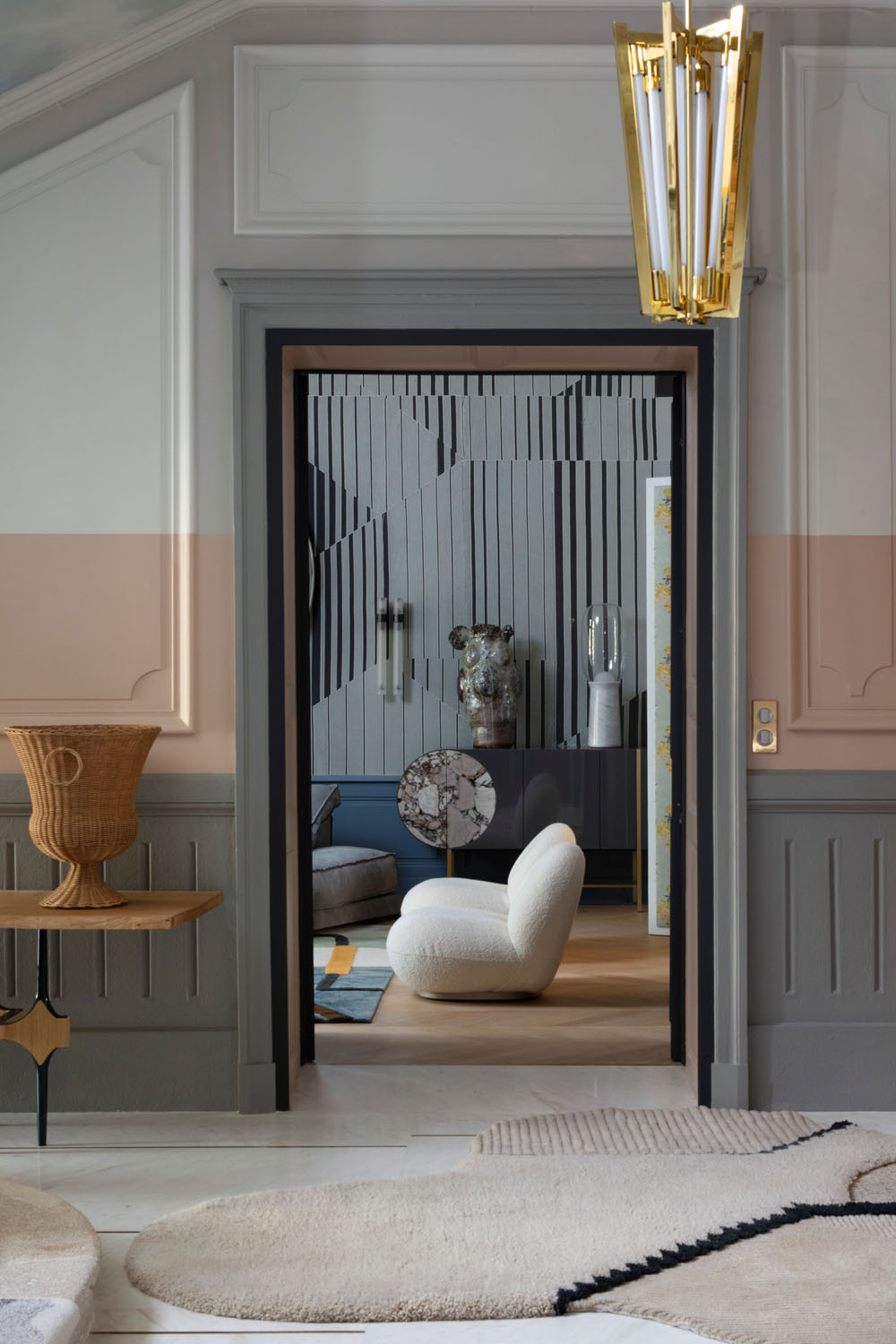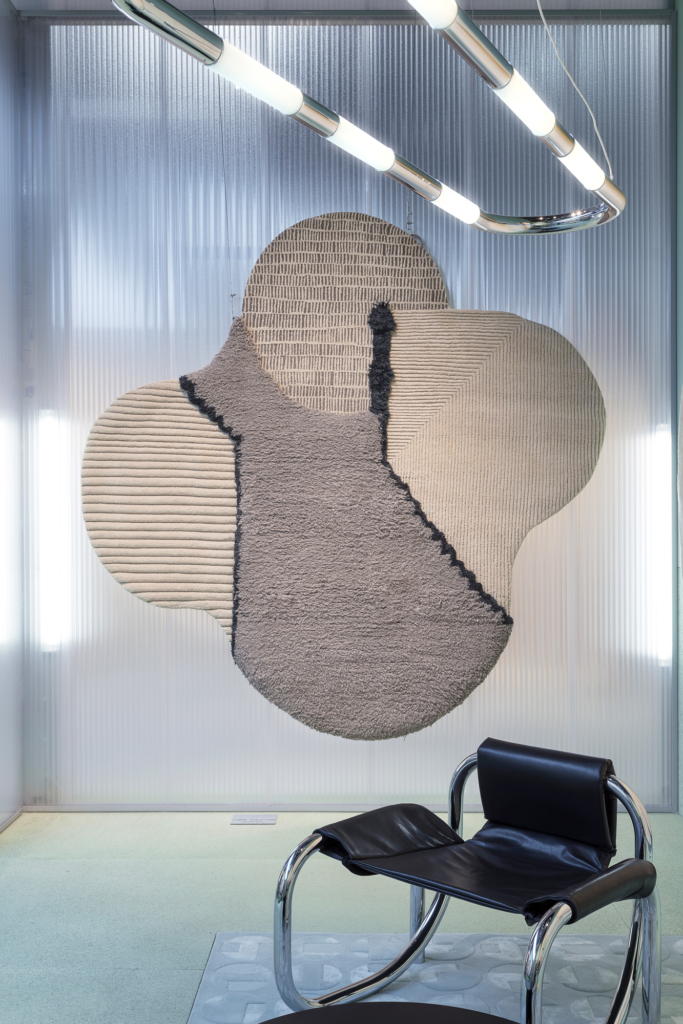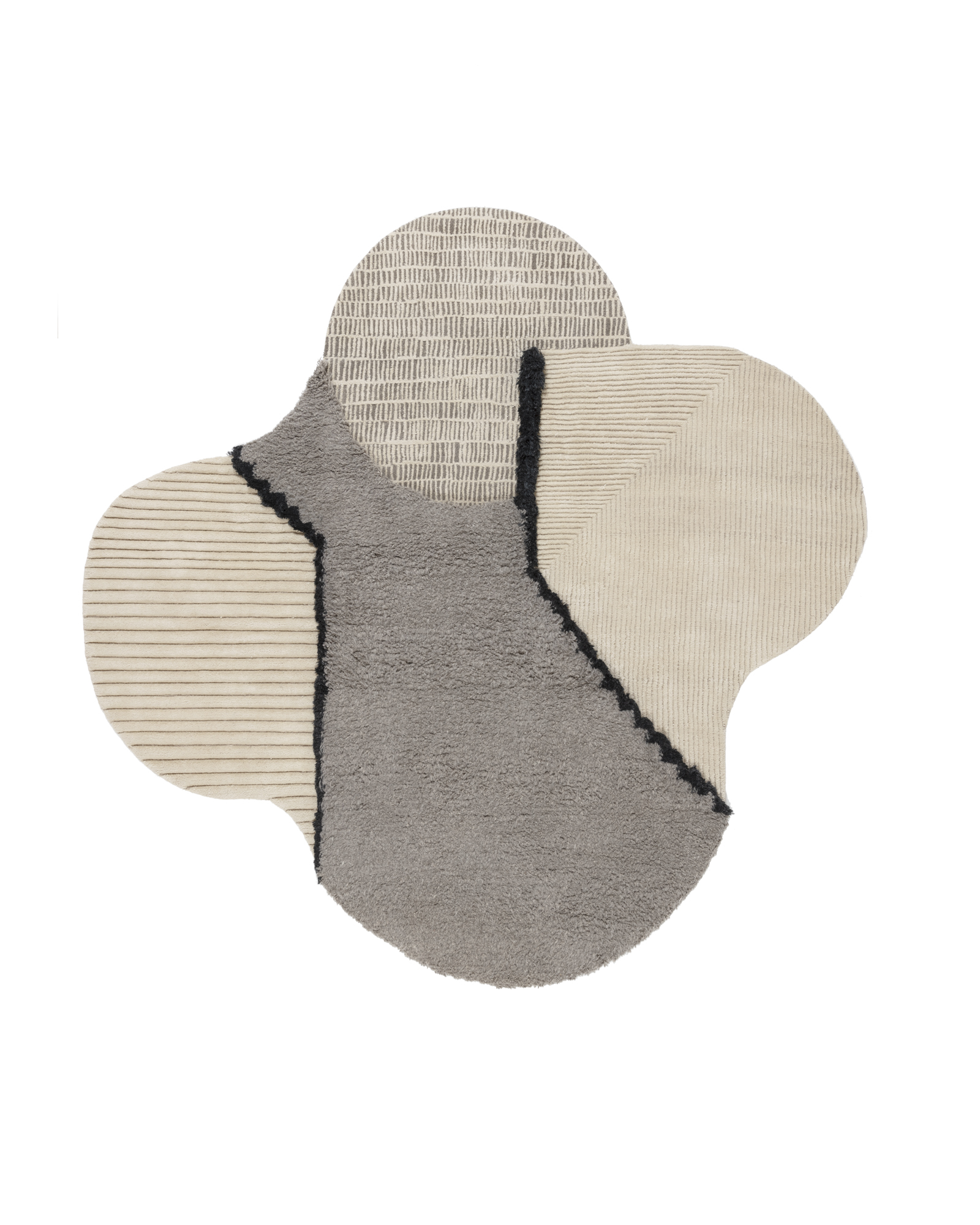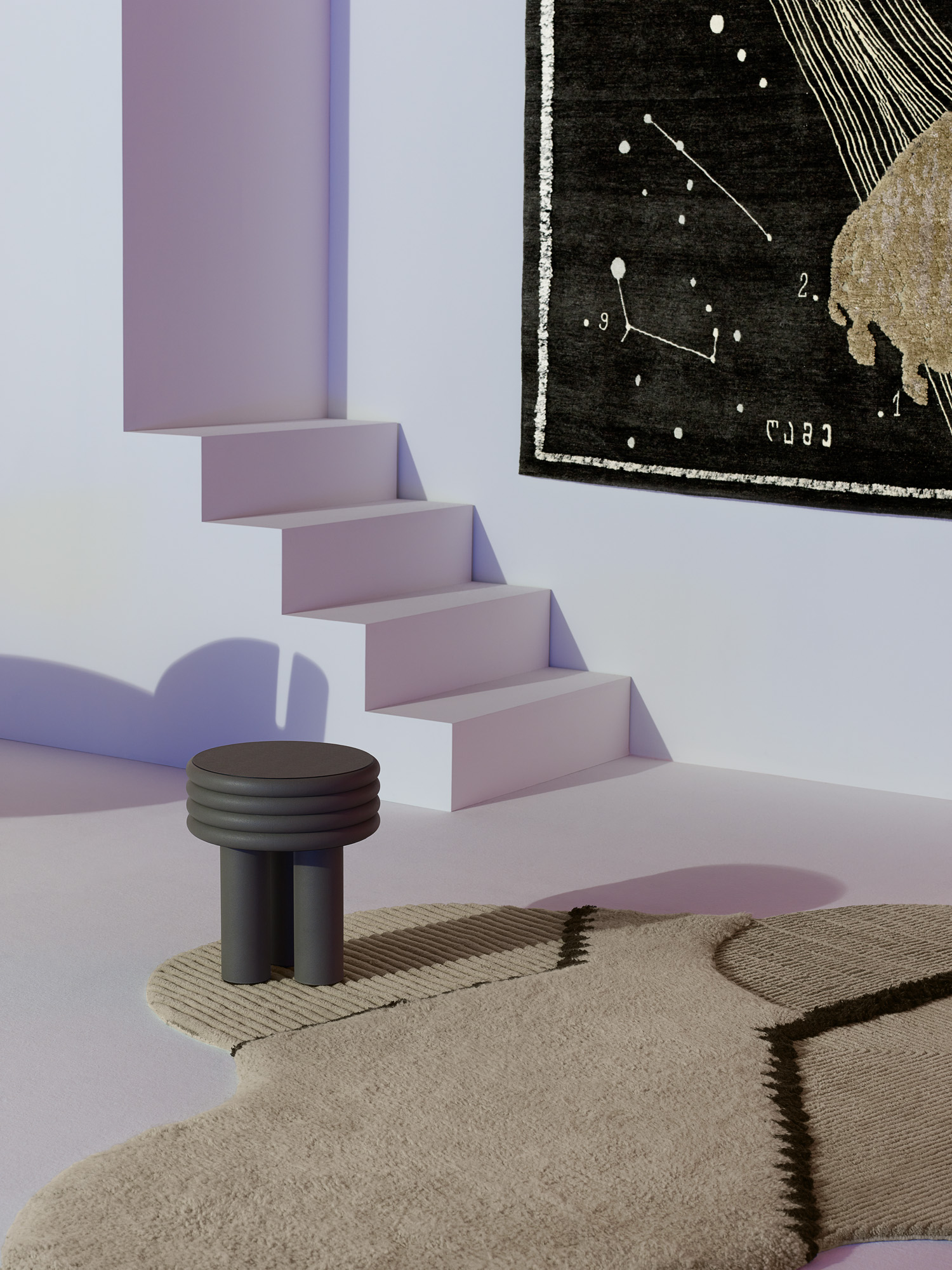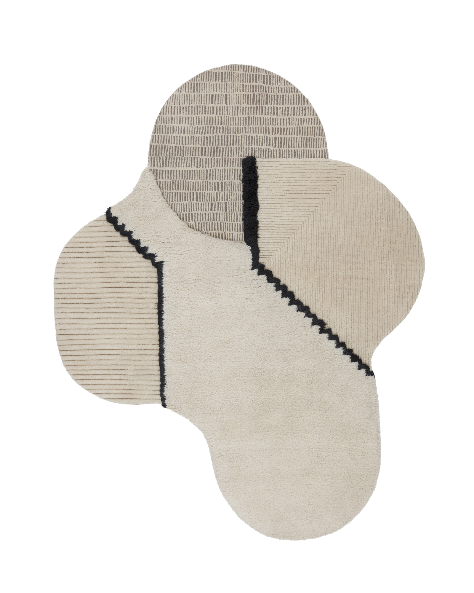A constellation of deconstructed forms crash against one another in Studiopepe’s Lunar Addiction collection. Each rug is articulated by a series of contrasts: complex patterns against visual regularity; flat surfaces alongside three-dimensional components; rough versus smooth textures. The rugs’ asymmetrical configurations are interrupted by pure graphic elements, giving each composition a contemporary edge. Each piece is composed of a shaggy pile in natural Himalayan wool juxtaposed against ultra refined and finished sections that are meticulously sculpted by hand.