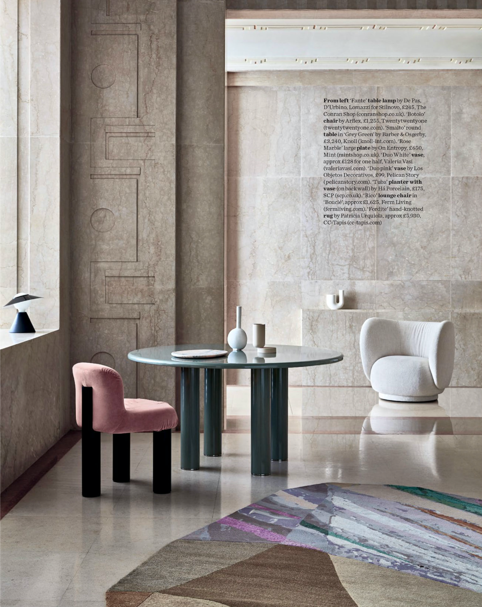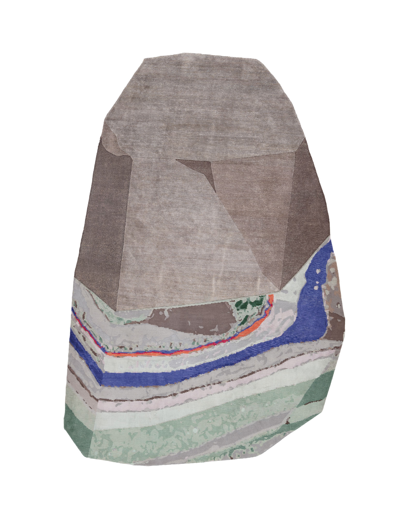 Fordite is a byproduct of the car manufacturing industry: a multicolored stratum of enamel automotive paint that has built up over time within the factory, which is then baked and polished until it resembles a jewel. Inspired by this material, Patricia Urquiola has integrated a similar approach to sustainability in the creation of these rugs. The Himalayan wool, pure silk and aloe used was sourced from the material excess left over from cc-tapis’s regular production process. The rugs maintain the same layered appearance as Fordite, recreated with recycled wool and accented with lurex threads.