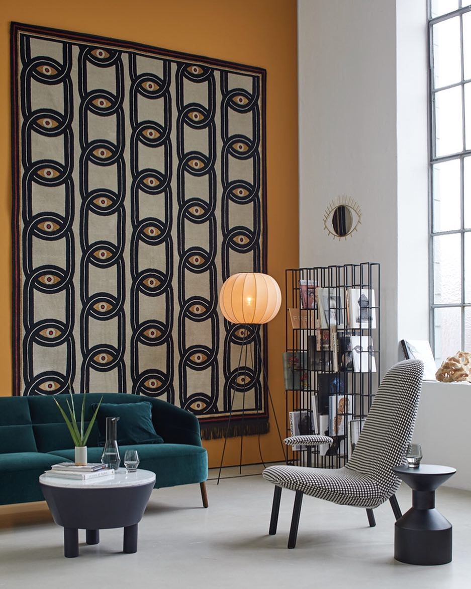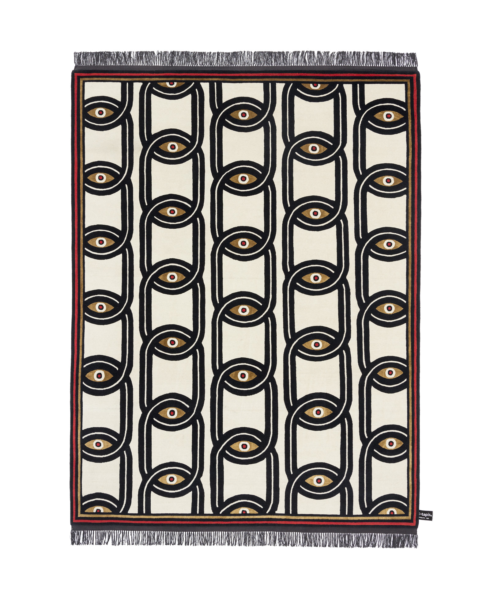 Designed by Milanese graphic designer and artist Federico Pepe, also known as Le Dictateur. The rug Eyes in chains forms part of an elegant and playful collection of 3 rugs also including Boyakatekka and Pilgrimage in Tokyo. All 3 rugs containing the signature style of Le Dictateur.