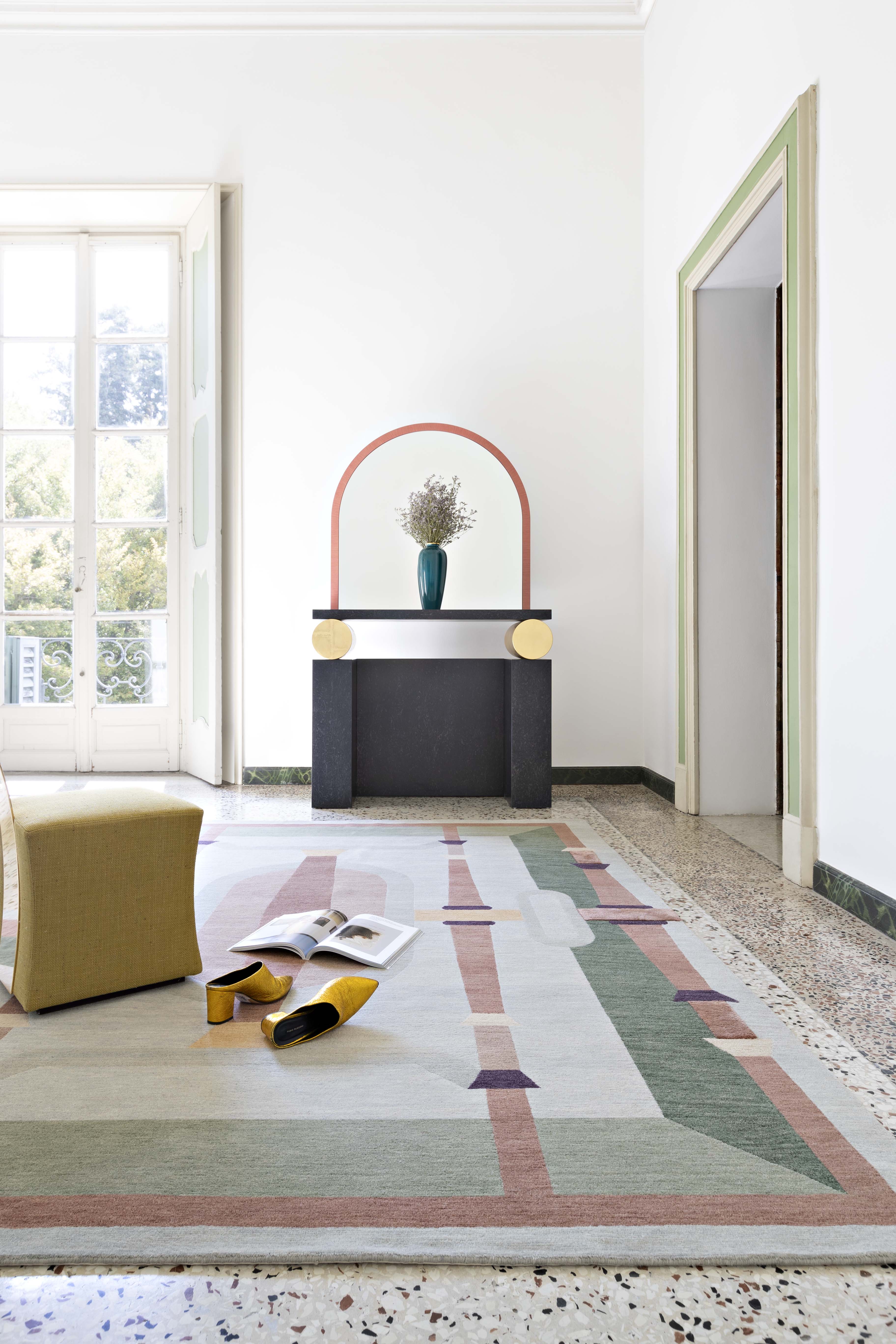 The ‘Cinquecento’ collection celebrates the use of perspective during the Italian Renaissance period. The geometric and colored areas are selected and developed into an artwork made of lines and forms, inspired ?by masterpieces of that period by artists such as Domenico Veneziano, Ludovico Mazzolino and Giovanni Bellini. The focus of the project is to maintain the perspective of each piece, dividing the works into macro-areas whilst keeping the primary color combinations.