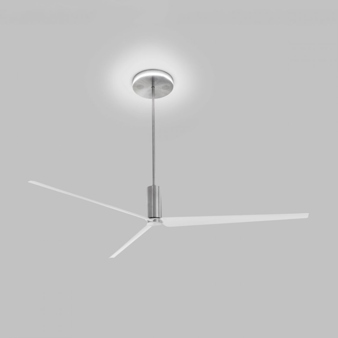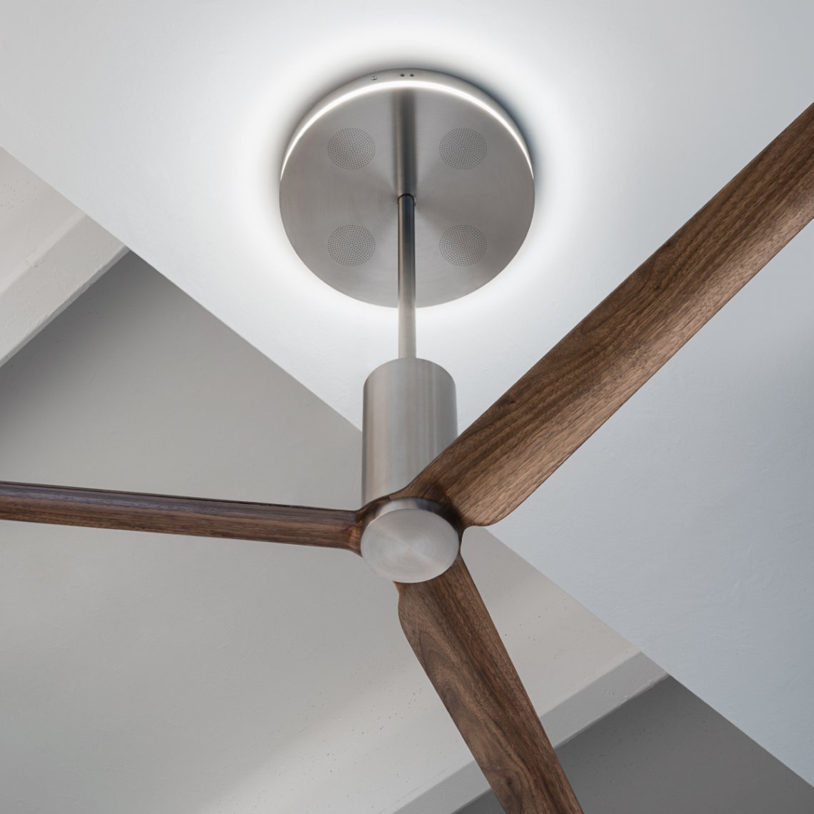Ceiling fan (? 2100 mm) in AISI 316L stainless steel, with wood and carbon fiber blades, natural wood essence or lacquered. Integrated LED lighting, loudspeakers for Bluetooth connection and ionization/ozonation system technology, remote control included. Product suitable for indoor installation