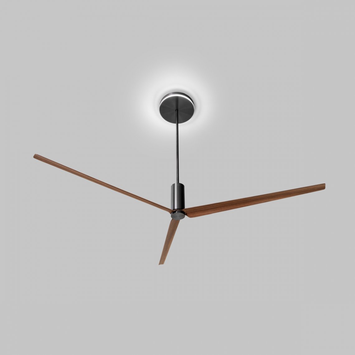 Ceiling fan (? 2100 mm) in AISI 316L stainless steel, with wood and carbon fiber blades, natural wood essence or lacquered. Integrated LED lighting, remote control included. Product suitable for indoor installation
