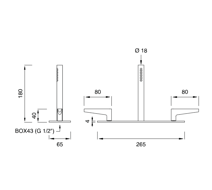 Rim mounted set of 2 progressive mixers with retractable cylindrical hand shower ? 18 mm