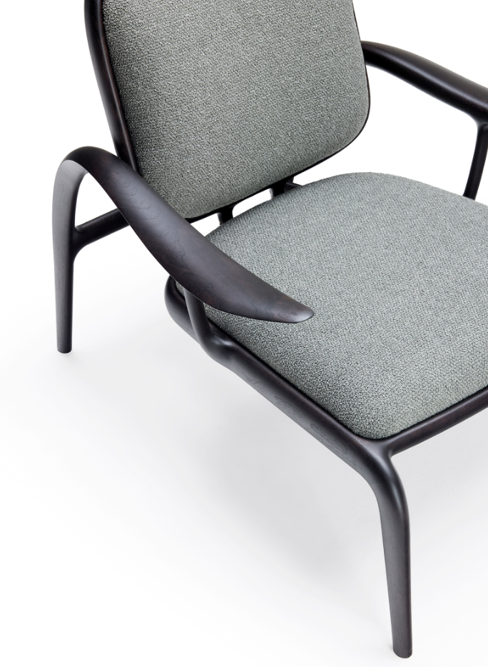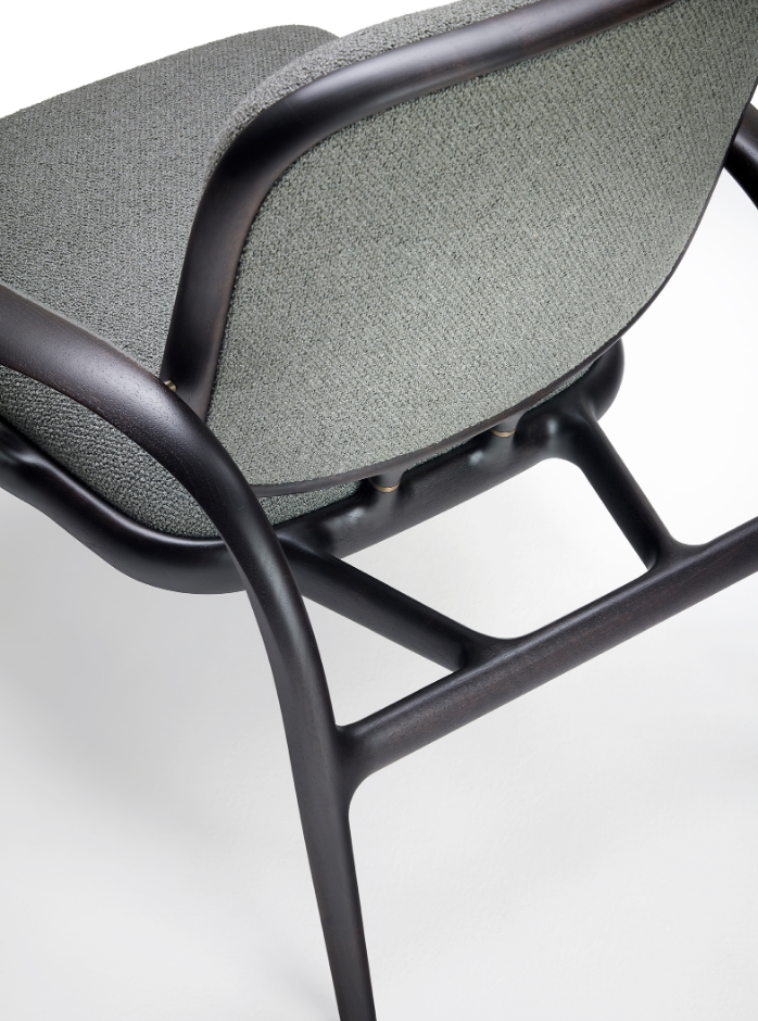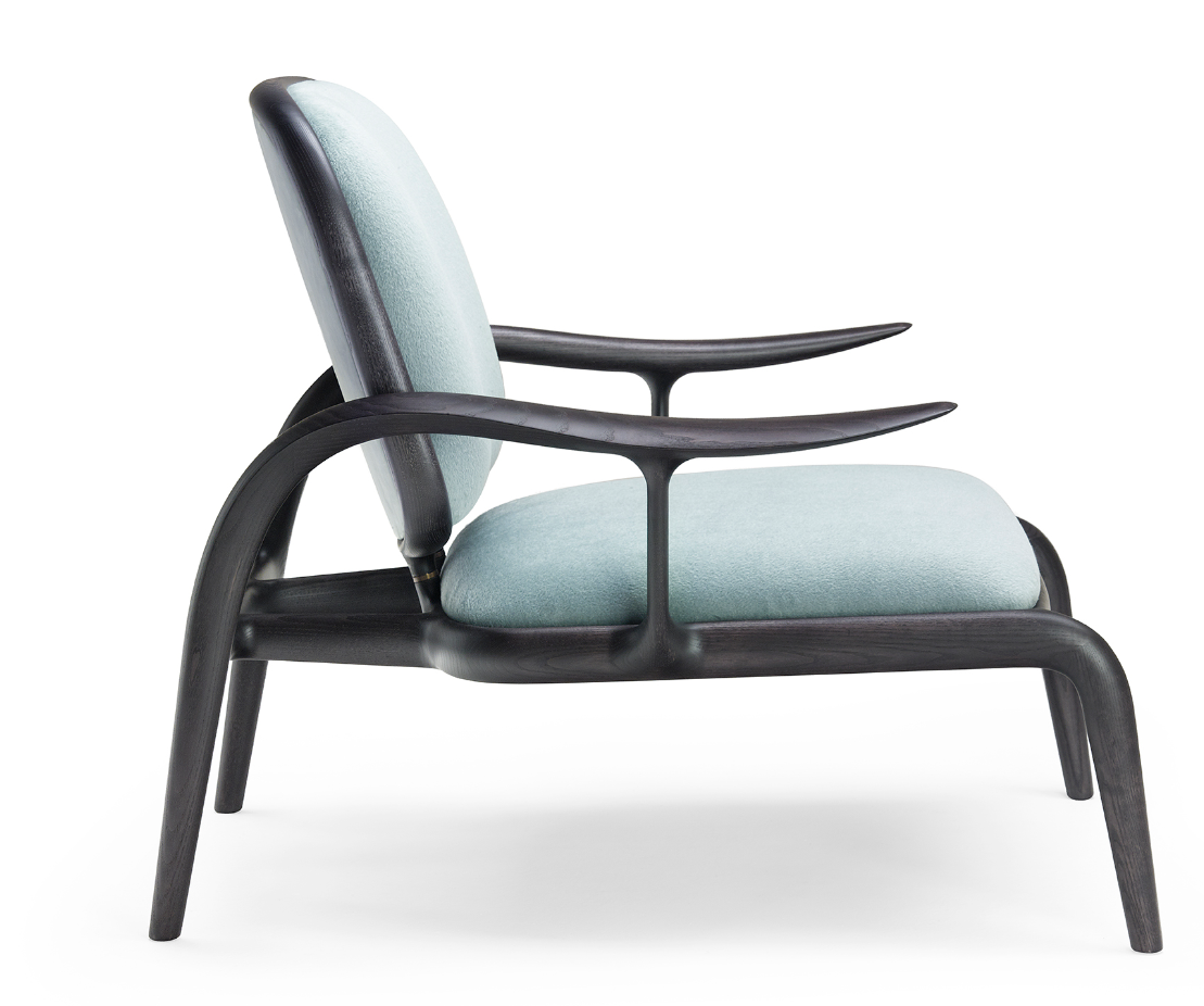 La struttura portante è sorretta da dei tiranti obliqui di sezione ellittica che fanno lavorare il legno in flessione, come fosse una balestra che sospende la seduta imbottita, mentre le sue superfici sono impreziosite da ricercate finiture lignee – in massello di noce o frassino – e da dettagli in ottone massiccio. Con un’ampia voluta che dal piede posteriore risale verso il bracciolo, si delinea un moto fluido ascendente, un segno iconico e inconfondibile.