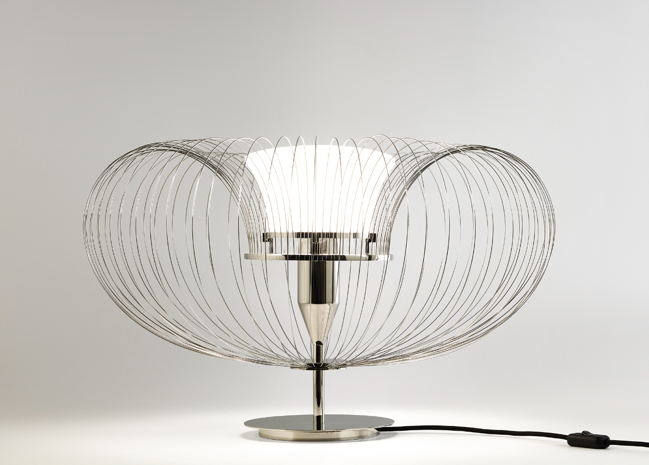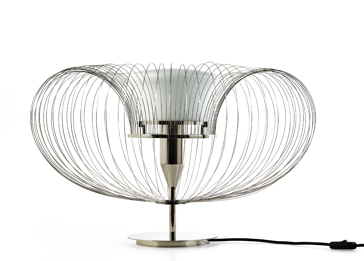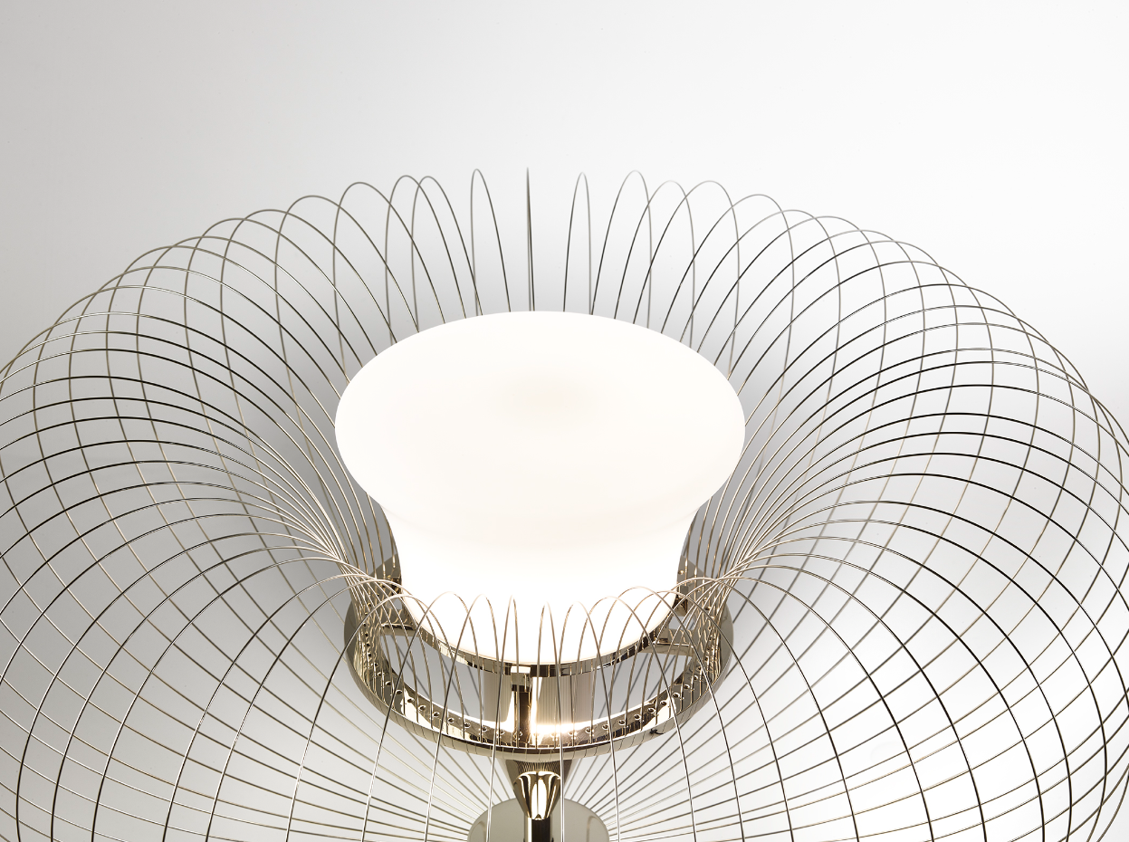 Steel Flower è una lampada da tavolo e terra in nichel lucido e acciaio. Essenziale e concettuale, ricrea la forma di un elemento naturale, il fiore, attraverso l’utilizzo di materiali industriali. Il paralume è in vetro bianco sabbiato e simula la parte centrale della pianta mentre intorno 64 fili in metallo sono ripiegati su sè stessi come a formare la corolla di petali.