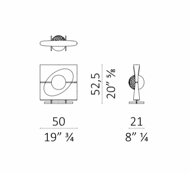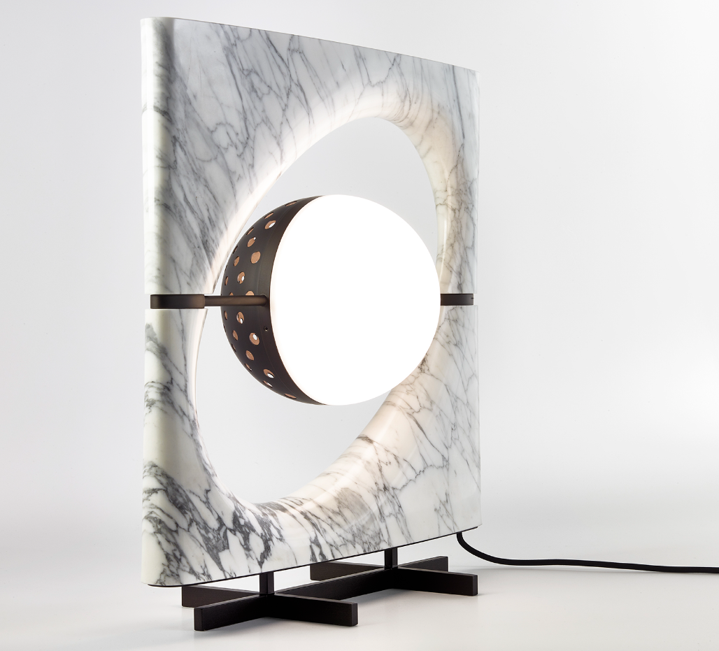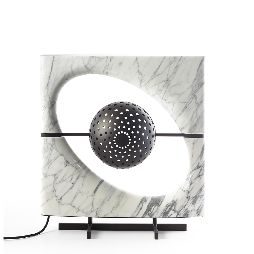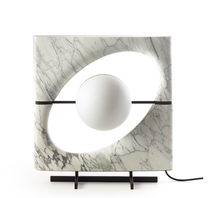 La lampada è composta da un corpo luminoso di forma sferica che sembra essere sospeso all’interno di uno spazio ellittico, proprio come Saturno mentre gravita nel suo sistema di anelli. Il paralume è formato da due semisfere: una in vetro sabbiato bianco che funge da fonte luminosa diffusa e una in metallo forato che proietta fasci di luce direzionali. Il corpo della lampada è composto da una cornice scolpita a partire da un blocco unico di pietra, accuratamente selezionato per esaltarne le venature naturali, disponibile in marmo Cervaiole. La lampada è sorretta da un piedistallo in metallo.
