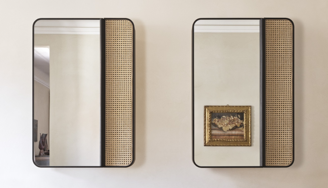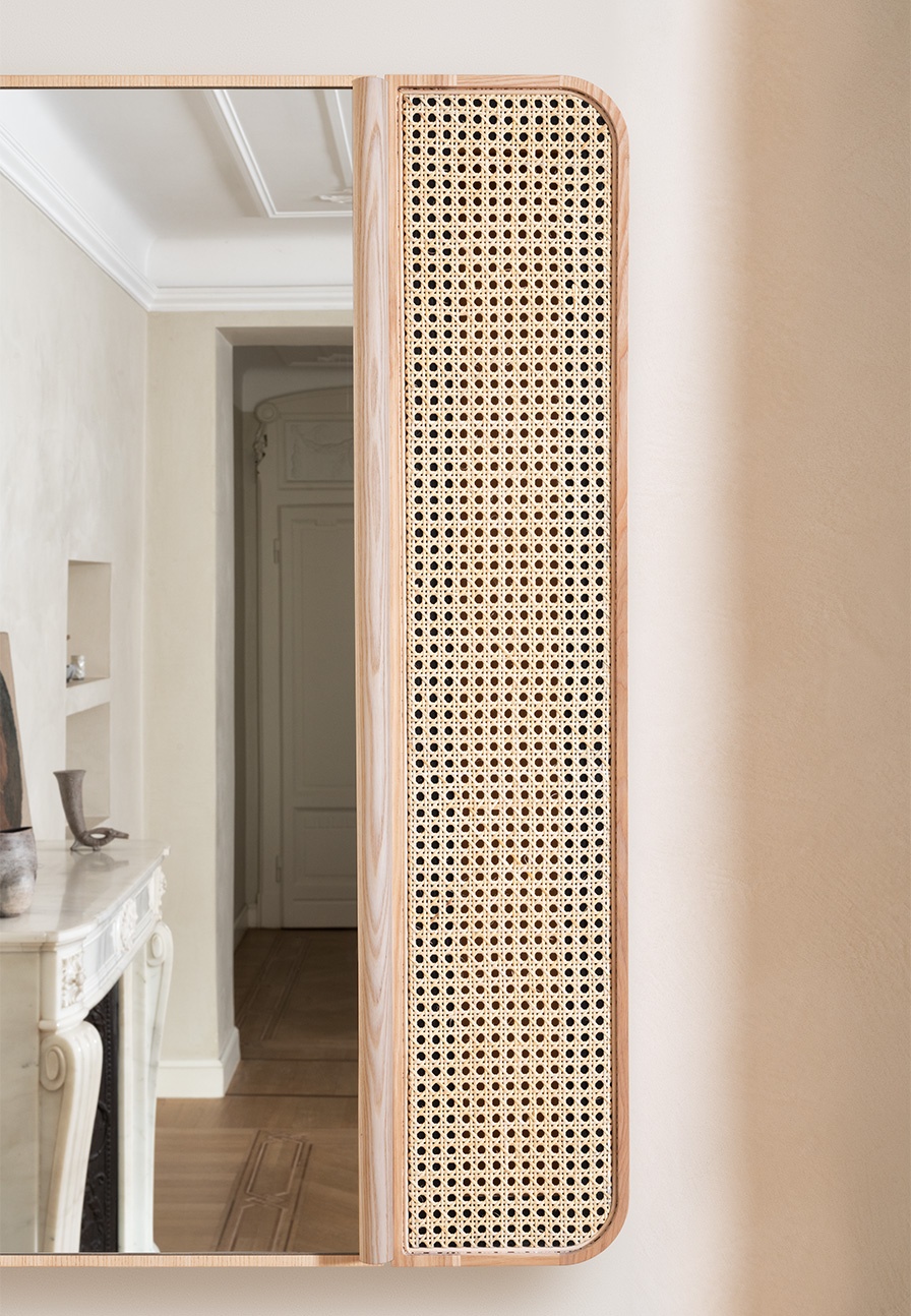 矩形鏡柜,帶雙門,天然或黑色染色實心白蠟木框架和天然維也納稻草制成的右前門