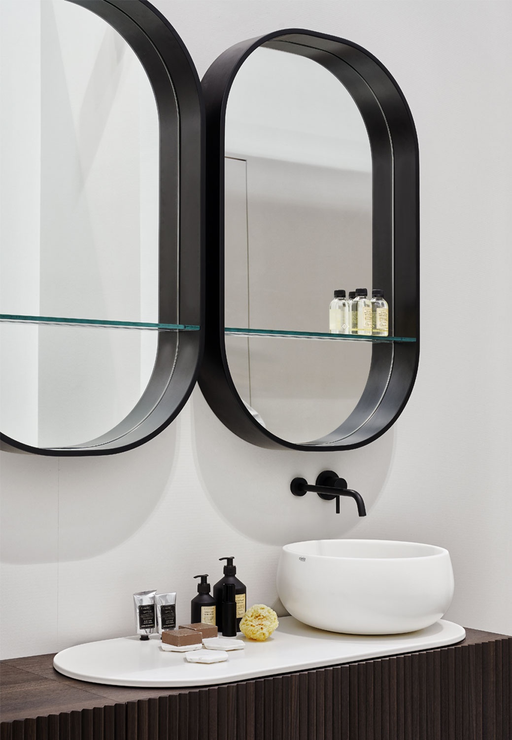 帶玻璃擱板的鏡子,擱板上有 LED 燈